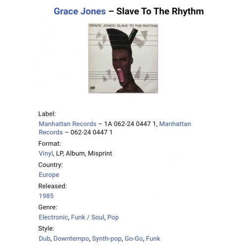 Вінілова платівка. Сьомий, в дискографії, студійний альбом, Американської (родом з Ямайки) моделі, кіноактриси і музичної виконавиці стилів фанк, диско, ритм енд блюз, реггі, поп, Грейс Мендози Джонс (Slave To The Rhythm) 1985. Випуск фірми (Manhattan Records) Europe, 1985-ий рік. Оригінальне, першопресове, Європейське видання. Стан платівки ЕХ+. Конверт глянцевий. Стан конверту EX+. Відправка по Україні службами доставки: Нова Пошта, Укр Пошта, Делівері. Також відправляємо посилки за кордон по цілому світу.
