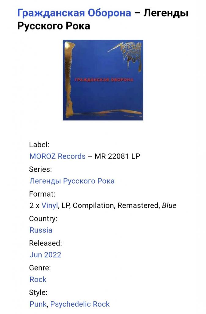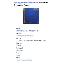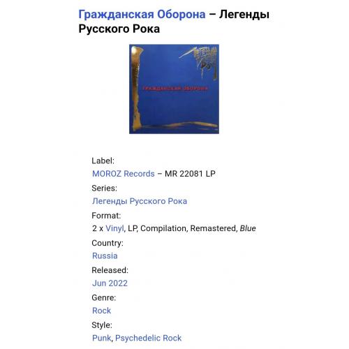 Вінілові платівки. П'ята, (не офіційна) збірка найкращих хітів російської (радянської) панк-рок, психоделік-рок групи з Сибіру, Гражданская Оборона, до складу якої за весь період часу входиои Єгор Лєтов, Яна Дягілєва, Костянтин Рябінов, Андрй Бабенко, Андрій Машковцев, Андрій Васін, Олександр Кліпов, Ірина Рябінова, Олександр Бусел, Олег Івановський, Олександр Рожков, Валерій Рожков, Євгеній Філатов, Олег Ліщенко, Євгеній Ліщенко, Дмитро Селіванов, Ігор Жевтун, Євгеній Дєєв, Аркадій Клімкін, Олег Судаков, Ігор Староватов, Сергій Зеленський, Ігор Гуляєв, Олександр Андрюшкін, Анна Волкова, Аркадій Кузнєцов, Євген Кокорін, Євгеній П'янов, Наталія Чумакова, Олександр Чеснаков, Сергій Лєтрв та Павло Перетолчин (Легенды Русского Рока) 1985-2007. Випуск фірми (Moroz Records) Russia, 2022-ий рік. Оригінальне першопресове видання з двох платівок (2LP). Кольорові вініли (Coloured Vinyl). Лімітований тираж (Limited Edition). Видання нове, запаковане. Категорія S/S. Відправка по Україні службами доставки: Нова Пошта, Укр Пошта, Делівері. Також відправляємо посилки за кордон по цілому світу.