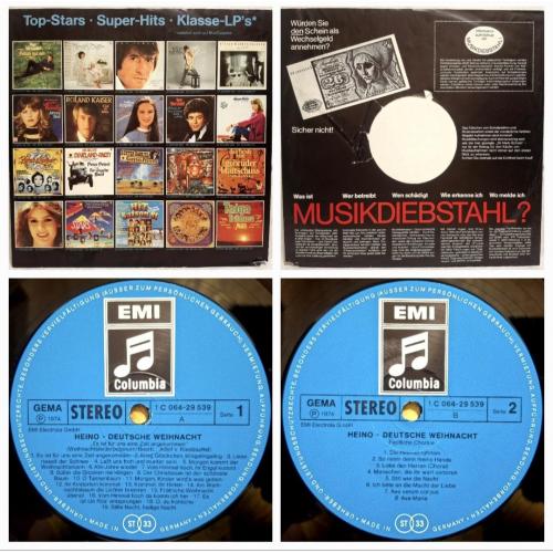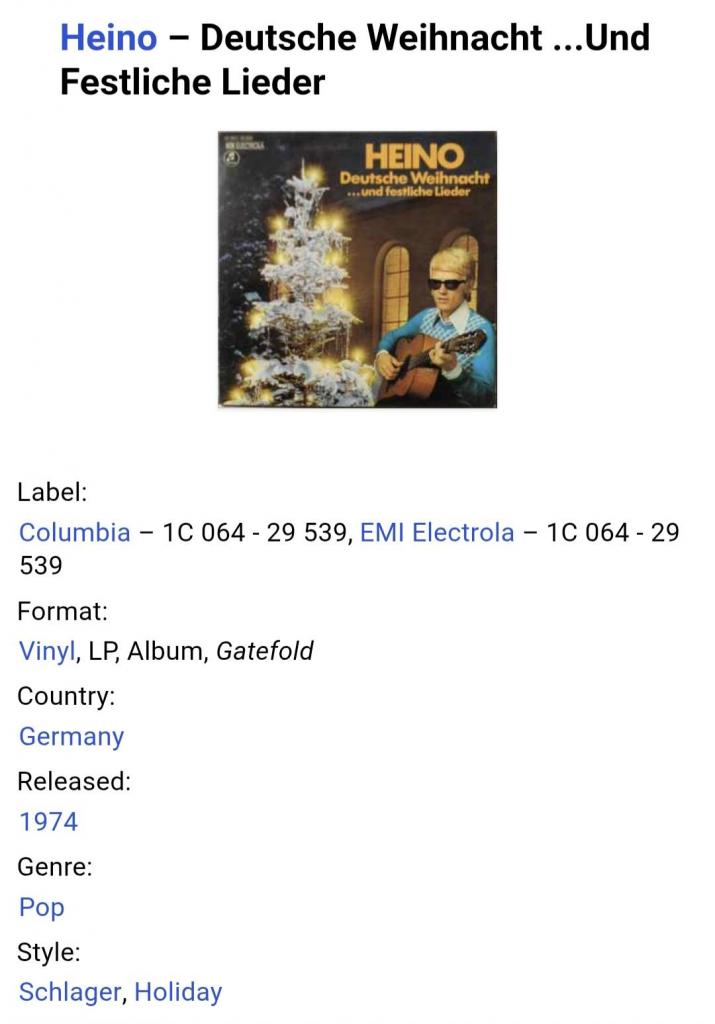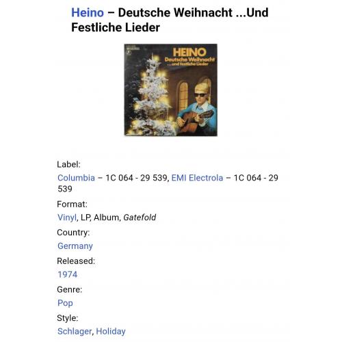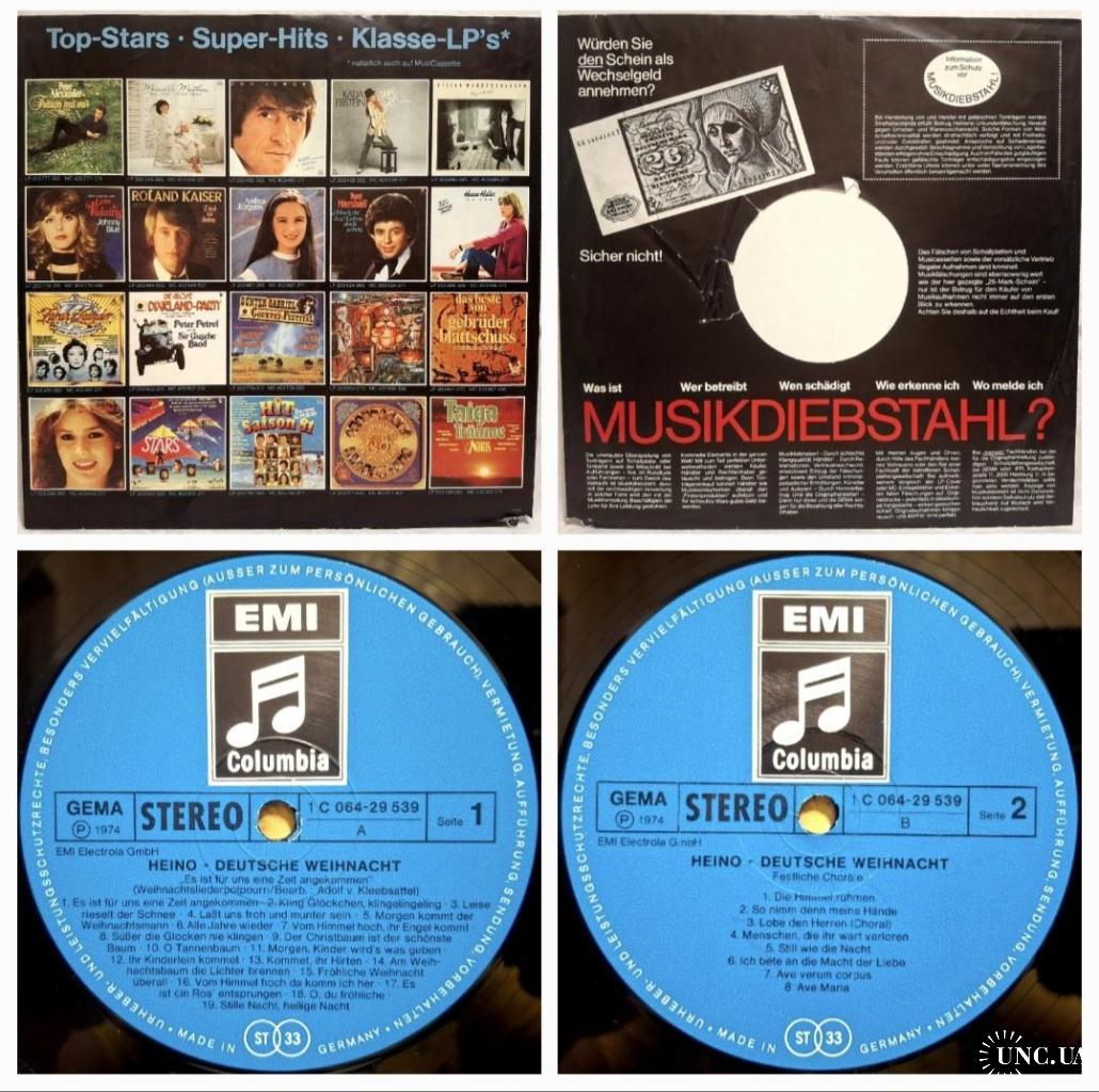 Вінілова платівка. Різдвяний, студійний альбом, одного з найпопулярнішого Німецького поп-шлягер виконавця 1950-60-их років, володаря титулів ордена Карла Валентина, премії Золотий Камертон, легендарного Хайнца Георга Крамма, більше відомого під сценічним ім,ям Heino (Christmas Album. Deutsche Weihnacht...Und Festliche Lieder) 1969. Випуск фірми (Columbia / EMI Elektrola) Germany, 1974-ий рік. Оригінальне, Німецьке видання. Спеціальний прес. Стан платівки EX-. Конверт ламінований, розворотний (Gatefold). В середині розвороту Різдвяний декор аплікація, Різдвяна сцена. Лімітований тираж (Limited Edition). Стан конверту ЕХ+. Відправка по Україні службами доставки: Нова Пошта, Укр Пошта, Делівері. Також відправляємо посилки за кордон по цілому світу.
