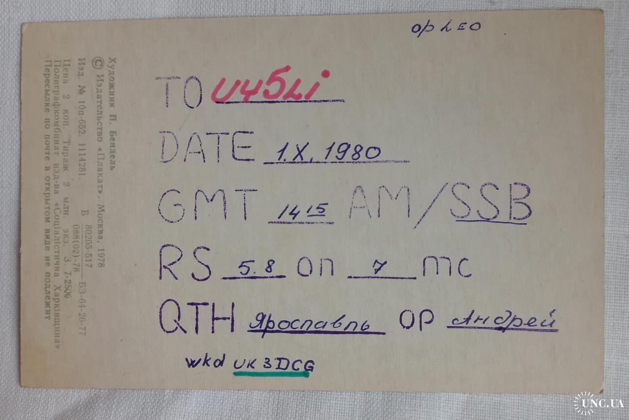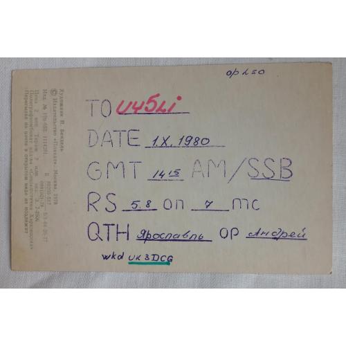 1961-1980Изд-во «Плакат»,Москва. Т. 2 млн. Заполнена как QSL-карточка. На лицевой стороне стоит штамп радиолюбительского позывного. На обратной - данные радиообмена в эфире. Без дефектов. Состояние открытки отличное.