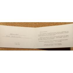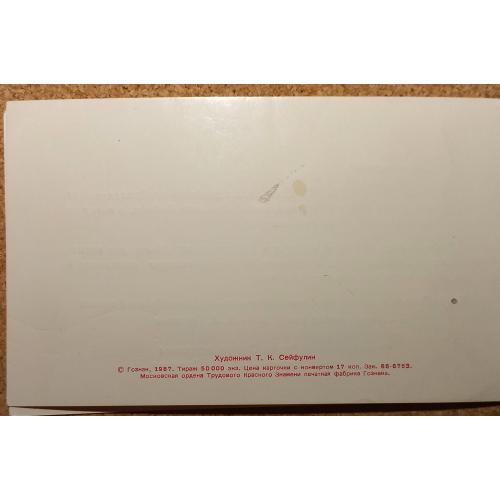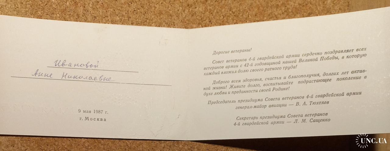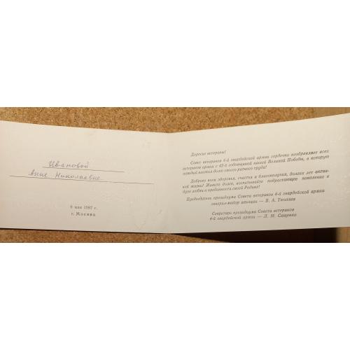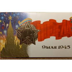 1981-2000На лицевой обложке изображена башня Кремля на фоне фейерверка и орден Победы. На развороте именная надпись участнику ВОВ (моей маме) с поздравлением с 42-й годовщиной Великой Победы. Московская печатная фабрика Гознака. Тираж 50 000. Карточка изготовлена на дизайнерской бумаге (картон) с блинтовым тиснением и нанесением золотистой фольги. Состояние практически без дефектов. Состояние отличное.