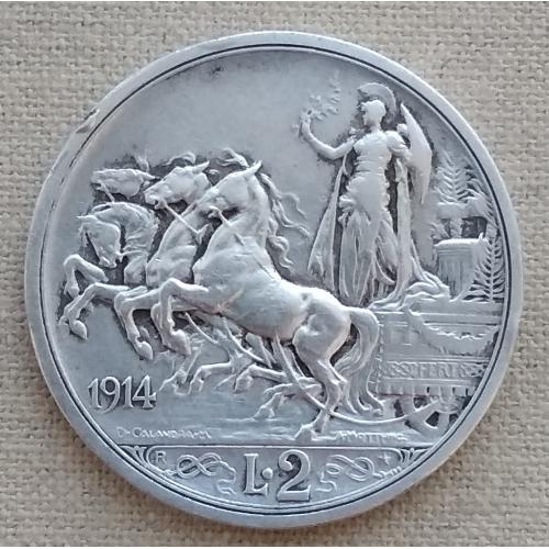ОригиналИталия 2 лиры, 1914 г, серебро