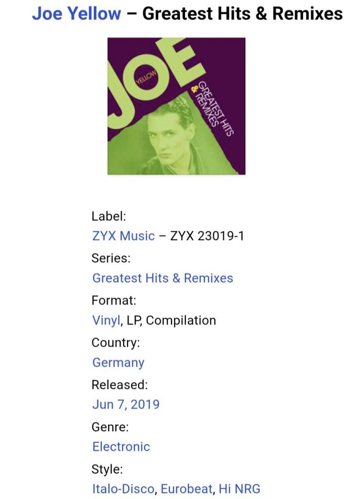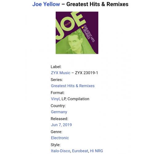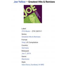 1981-2000Вінілова платівка. Офіційна, студійна збірка найкращих хітів, Італійського поп, італо лиско виконавця Домініко Річчіні, більше відомого під сценічним ім,ям Joe Yellow (Greatest Hits & Remixes) 1983-2001. Випуск фірми (ZYX Music) Germany, 2019-ий рік. Видання нове, запаковане. Категорія S/S. Відправка по Україні службами доставки: Нова Пошта, Укр Пошта, Делівері. Також відправляємо посилки за кордон по цілому світу.