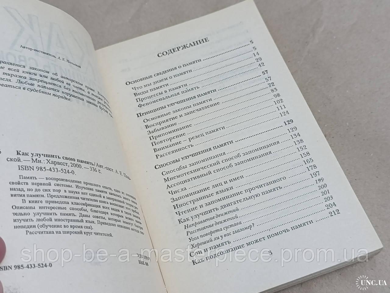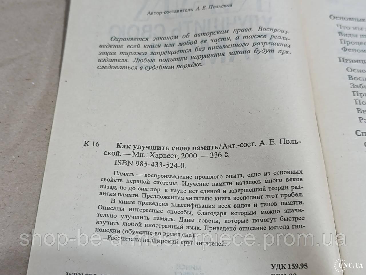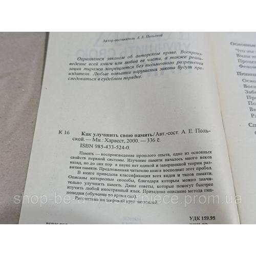 Как улучшить свою память/Авт.-сост. А. Е. Польской 2000 Мягкая обложка Состояние отличное. Легкие потертости обложки Мн.: Харвест, 2000. — 336 с. Память -воспроизведение прошлого опыта, одно из основных свойств нервной системы. Изучение памяти началось много веков назад, но до сих пор в науке нет единой и завершенной теории раз-вития памяти. Предложенная читателю книга восполнит этот пробел. В книге приведена классификация всех видов и типов памяти. Описаны интересные способы, благодаря которым можно значи-тельно улучшить память. Даны советы, которые помогут быстрее изучить любой иностранный язык. Приведено описание метода гип-нопедии (обучение во время сна). Рассчитана на широкий круг читателей.Ответы продавца на ваши вопросы