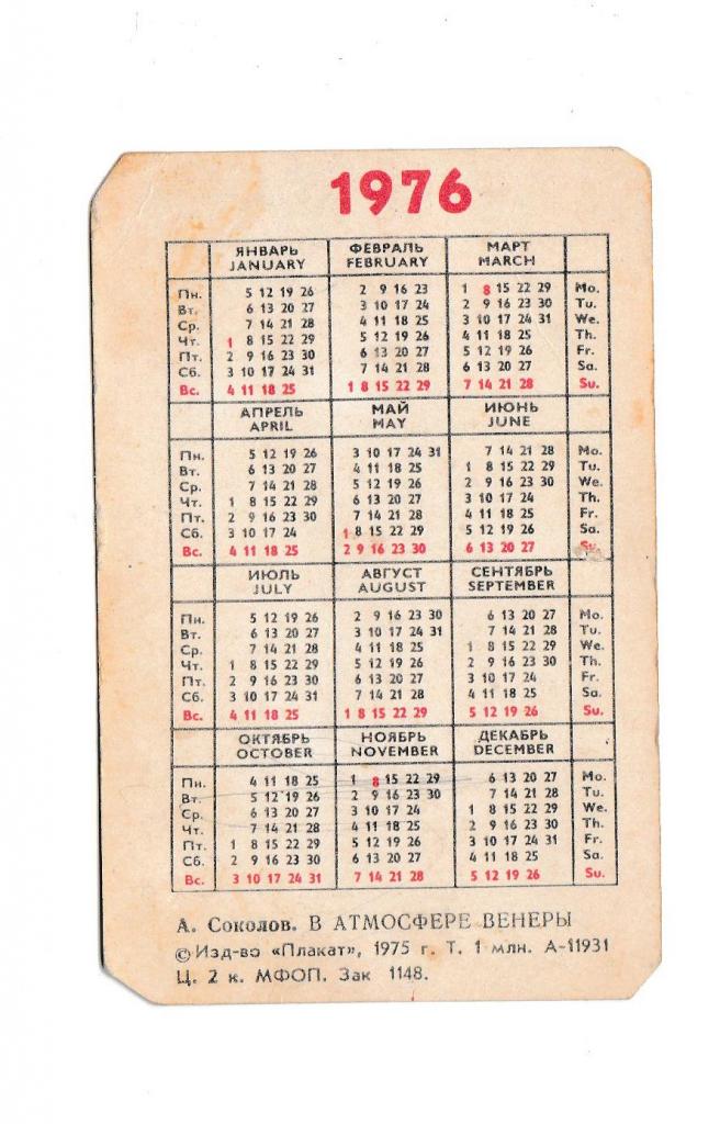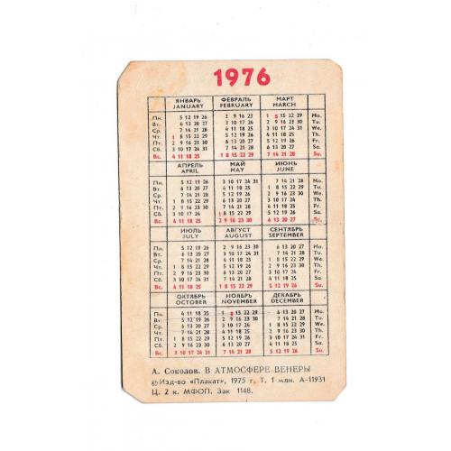 1961-1980Календарик 1976 Космос, В атмосфере Венеры.
