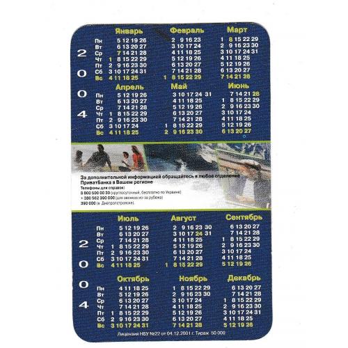 2001-2020Календарик 2004 Приватбанк, банк.