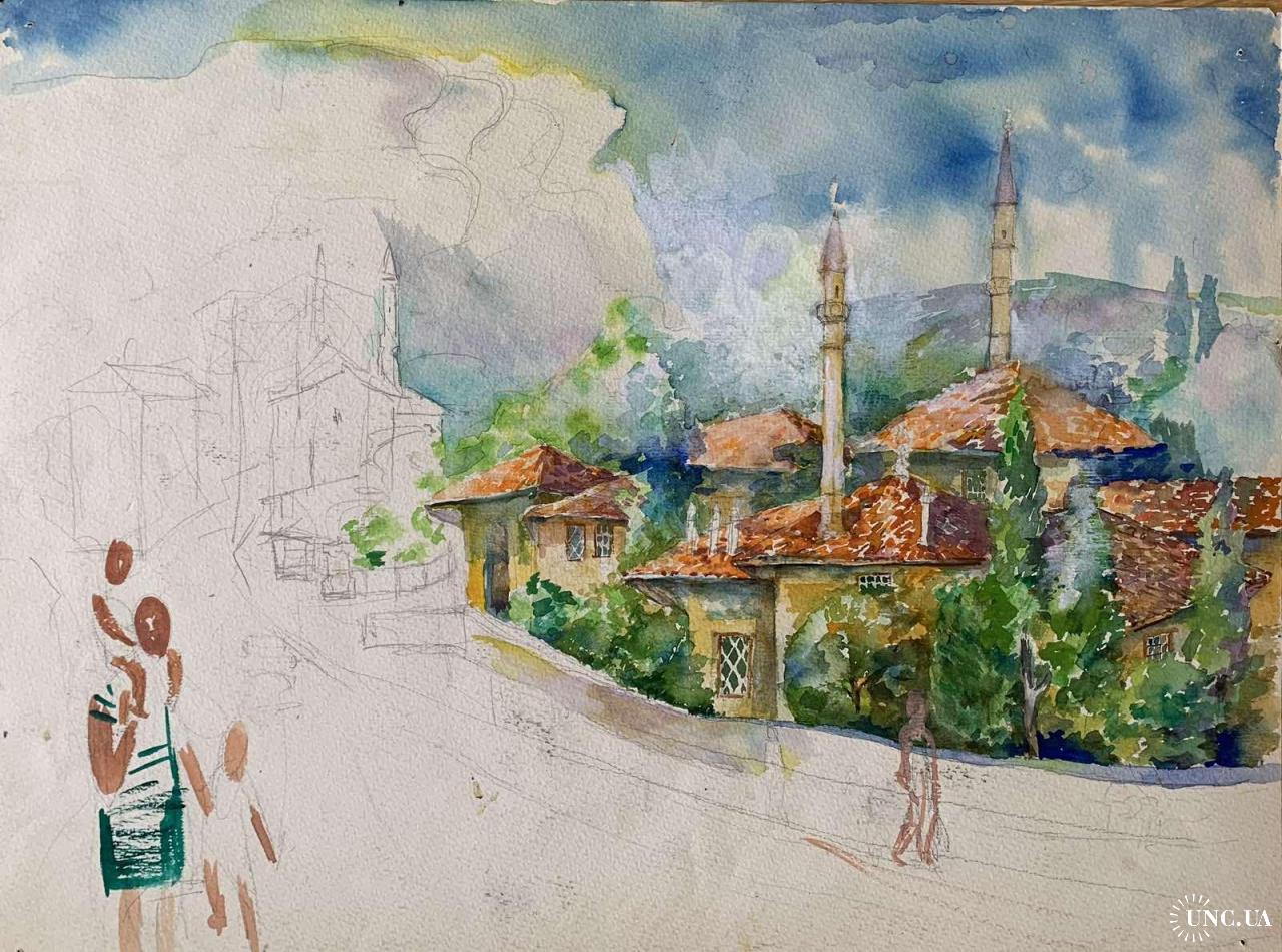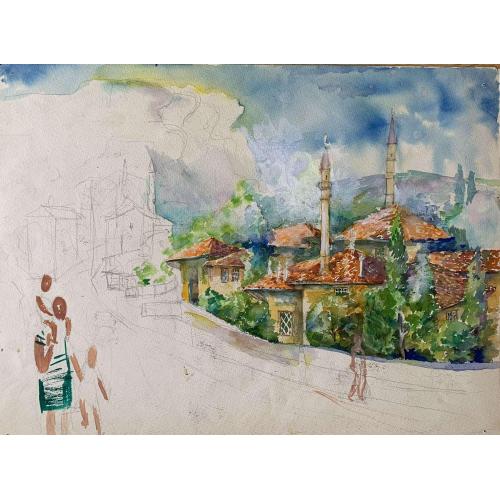 На зворотньому боці: Етюд. Кримське поселення. Акварель.