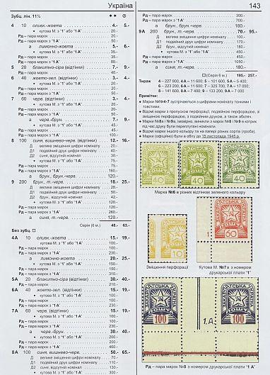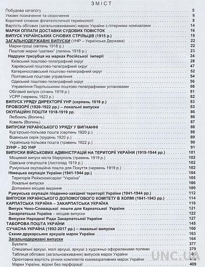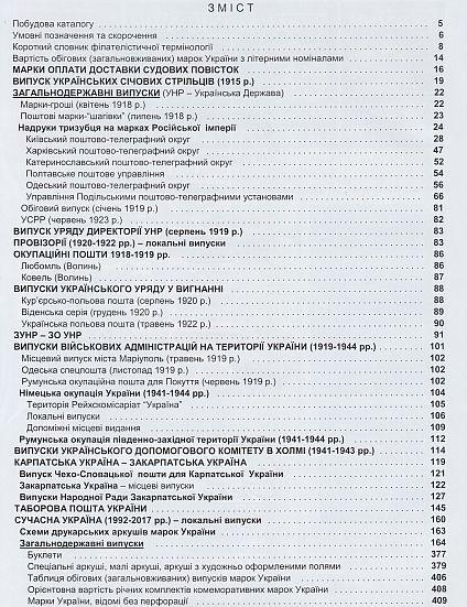 В этом издании каталога содержится описание следующих почтовых марок: украинских государственных марок 1992-2017 гг. + гашение штемпелем первого дня, марки для оплаты судебных повесток 1898-1920 гг., выпуск Украинских Сечевых Стрельцов 1915 года, выпуски УНР, ЗУНР, оккупационные почты 1918-1919 гг, провизории 1920-1922 гг., выпуски украинского правительства в эмиграции, выпуски военных администраций на территории Украины 1919-1944, выпуски УДК в Холме 1941-1943 гг., Закарпатской Украины 1939-1944 гг., лагерной почты Украины 1946-1950 гг. В каталоге представлены наиболее известные разновидности марок.