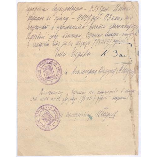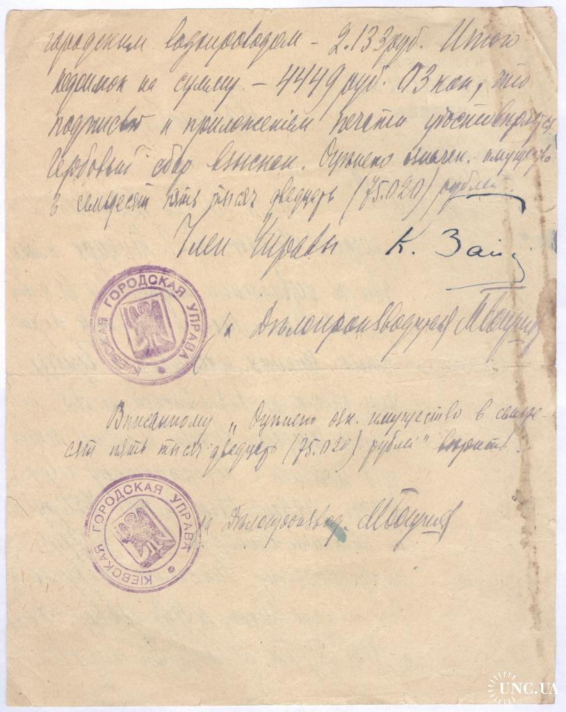 Удостоверение. Дано сие из Киевской Городской Управы А. Г. Нейкирх в том, что на недвижимом имуществе ее и совладельцев Елены, Марии и Владимира Генриховных Нейкирх, находящемся в Бульварном районе по Лазаревской улице № 5 по счетам Городской Управы числятся следующие недоимки: по оценочному сбору за 1917 г. - 928 рублей 78 копеек, за 1918 год - 750 рублей, по канализационному за 1918 год - 207 рублей, по губернскому Земскому сбору за 1916 год - 86 рублей 37 копеек, за 1917 год - 126 рублей 38 копеек и за 1918 год - 207 рублей 50 копеек. За пользование городским водопроводом - 2133 руб. Итого недоимок на сумму 4449 рублей 03 коп., что подписью и приложением печати удостоверяется. Гербовый сбор взыскан. Оценено означенное имущество в 75020 рублей."