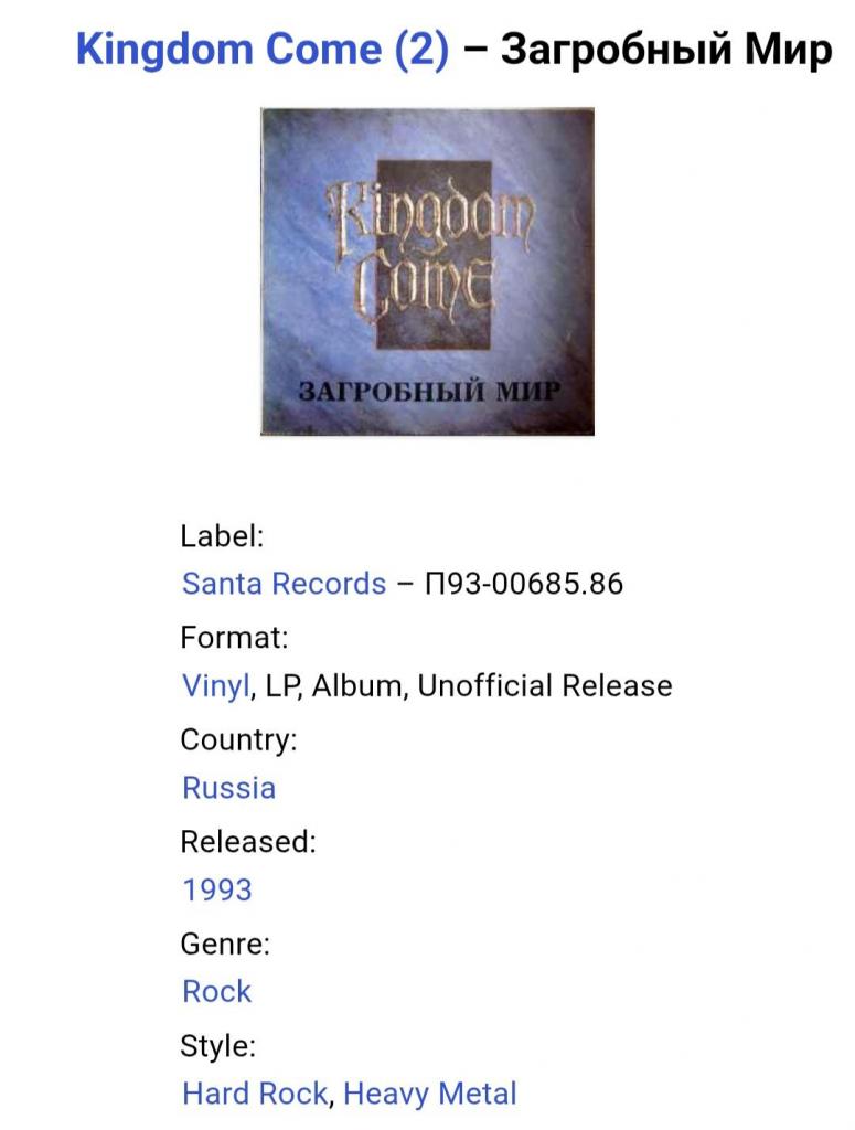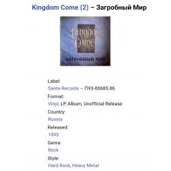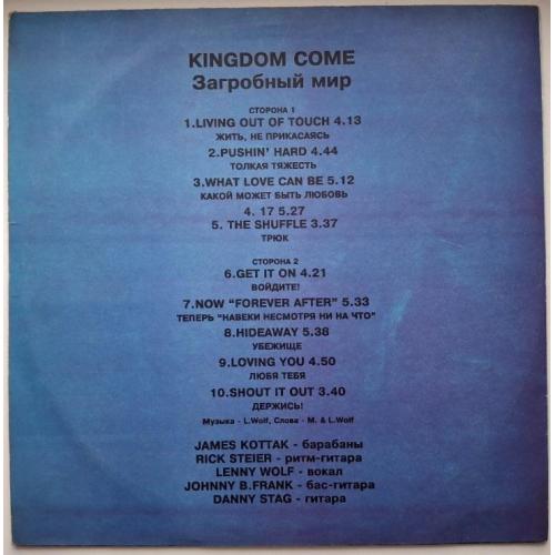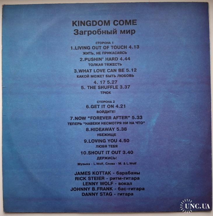 Вінілова платівка. Перший, дебютний, в дискографії, студійний альбом, Німецької хард-рок, глем-метал групи Kingdom Come, до складу якої, на той час, входили учасники Ленні Вольф, Денні Стек, Рік Штайєр, Джонні Б. Франк та Джеймс Коттак (Kingdom Come / Загробный Мир) 1988. Випуск фірми (Santa Records) Russia, 1993-ій рік. Неофіційне видання (Unofficial Release). Рідкісне (Rare). Стан платівки ЕХ-. Стан конверту NM-. Відправка по Україні службами доставки: Нова Пошта, Укр Пошта, Делівері. Також відправляємо посилки за кордон по цілому світу.