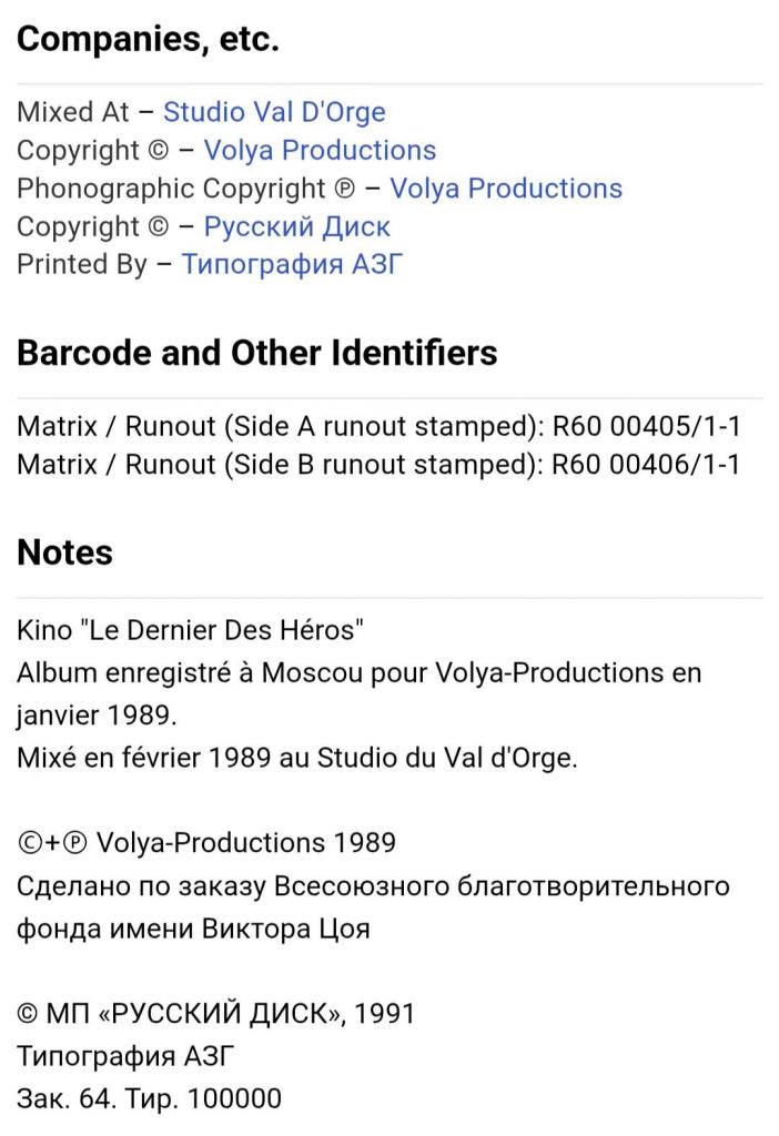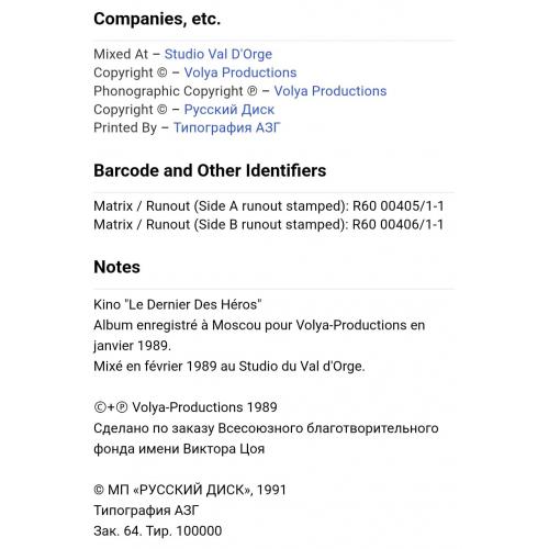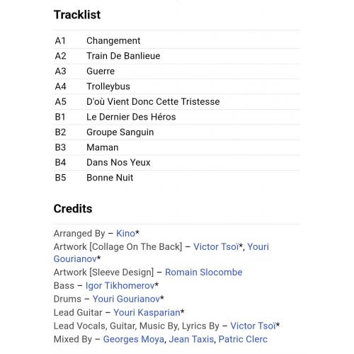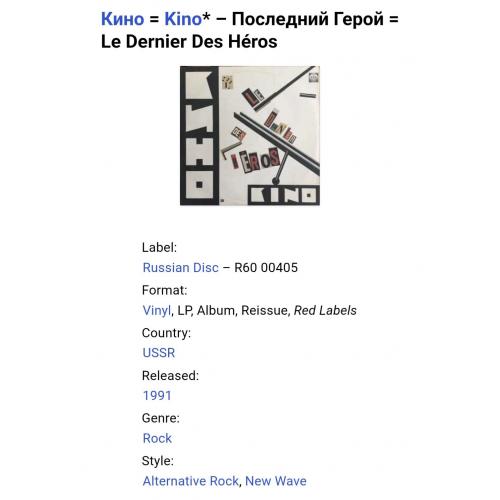 Вінілова платівка. Перша, прижиттєва, повномасштабна збірка найкращих хітів, російської (радянської) рок-групи нової хвилі, Кіно, яка складалася з учасників Віктора Цоя, Юрія Каспаряна, Геогрія Гур,янова та Ігоря Тихомирова (Последний Герой) 1989. Випуск фірми (Russian Disc) Russia, 1991-ий рік. Оригінальне видання. Стан платівки ЕХ. Стан конверту ЕХ+. Відправка по Україні службами доставки: Нова Пошта, Укр Пошта, Делівері. Також відправляємо посилки за кордон по цілому світу.