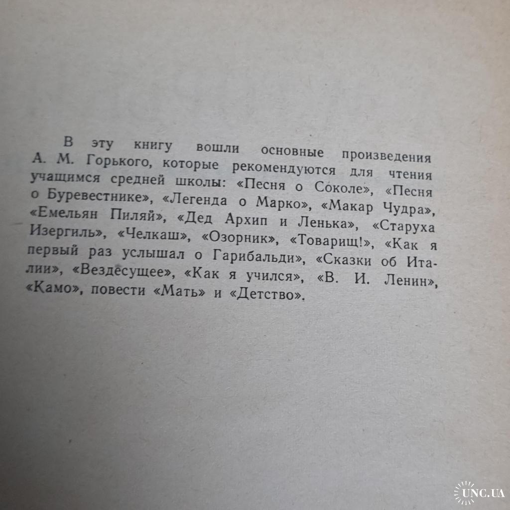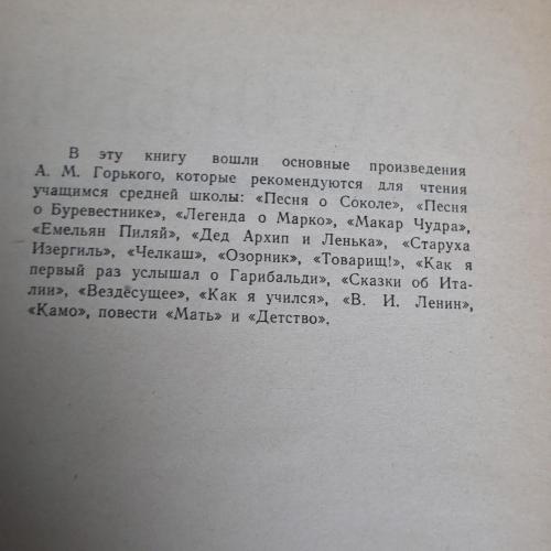 До цієї книги увійшли основні твори О. М. Горького, які рекомендуються для читання учням середньої школи: «Пісня про Сокола», «Пісня про Буревісника», «Легенда о Марко», «Макар Чудра», «Ємелян Піляй», «Дід Архип і Ленька», «Стара Ізергіль», «Челкаш», «Озорник», «Товариш!», «Як я вперше почув про Гарібальді», «Казки про Італію», «Всюдисуще», «Як я вчився», «В. І. Ленін», «Камо», повісті «Мати» і «Дитинство».
