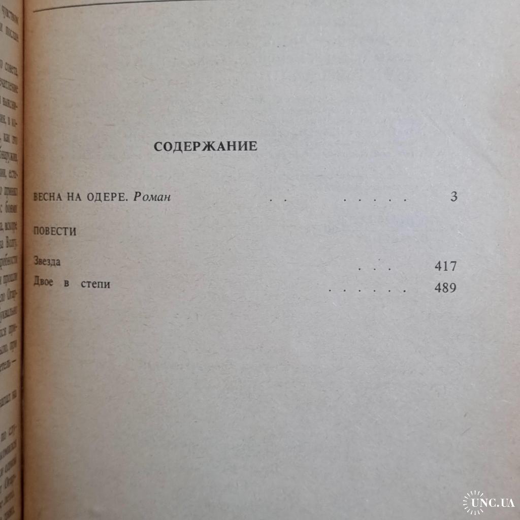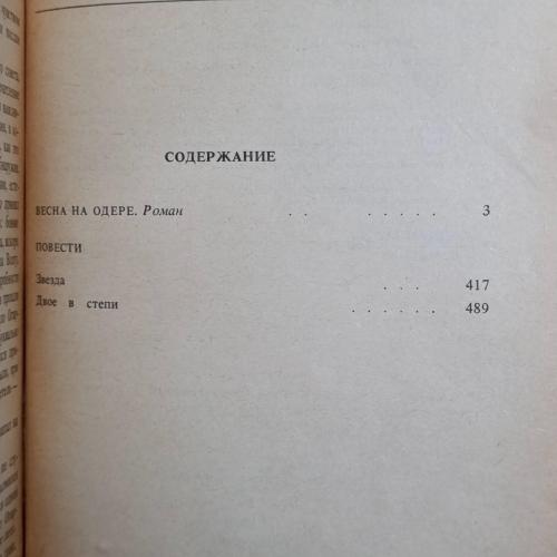 Відомий радянський письменник, учасник Великої Вітчизняної війни Еммануїл Генріхович Казакевич (1913-1962) у своїх творах відобразив ратний подвиг радянського народу. Важкі будні армійської розвідки («Зірка»), трагічна доля солдата, який порушив військовий обов'язок («Двоє у степу»), визвольна місія Радянської Армії, що врятувала народи Європи від гітлерівської окупації («Весна на Одері»), — ось теми творів, включених у цю книгу.
