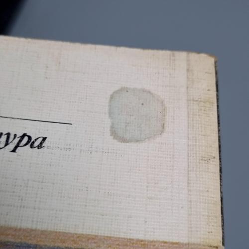 - Зношена обкладинка: На обкладинці є потертості, особливо на кутах і краях. Також на ній видно сліди бруду, що в'ївся в текстуру матеріалу.