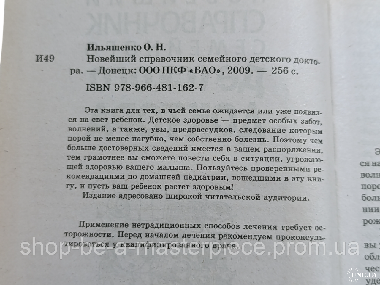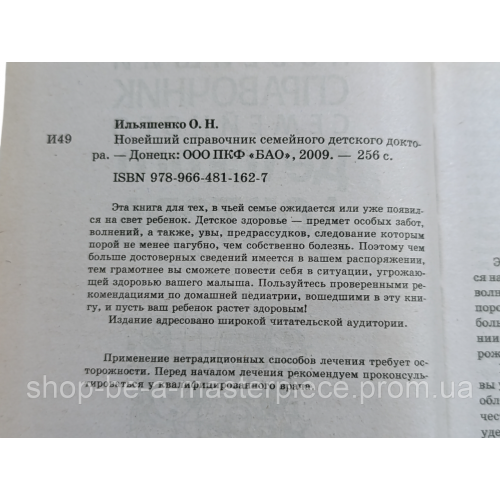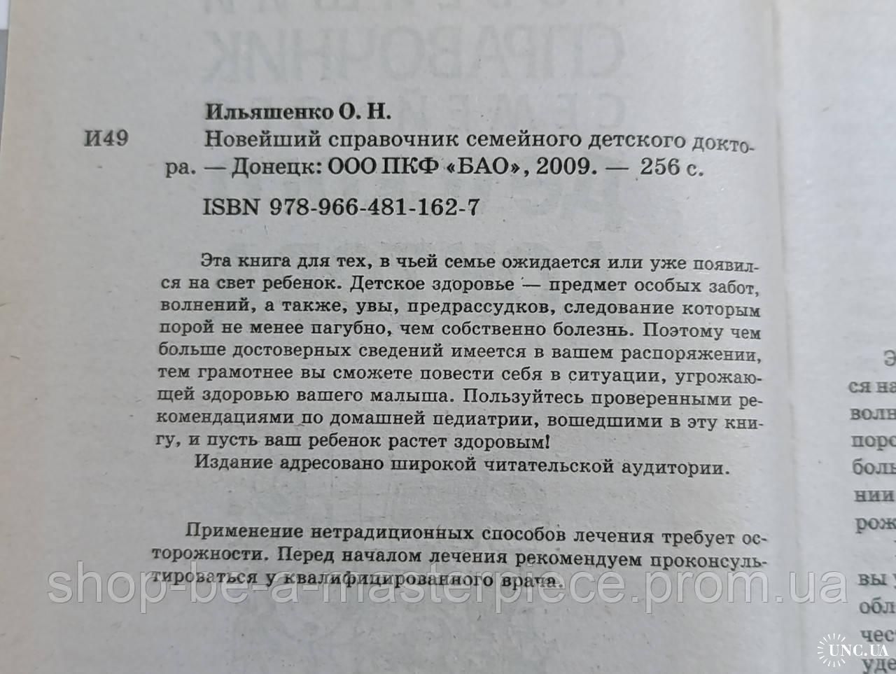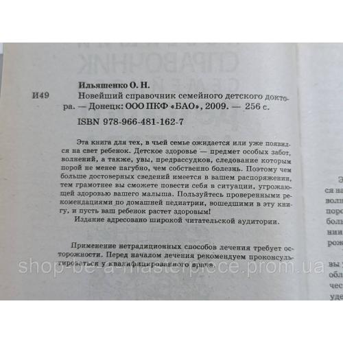 Книга Ильяшенко Ольга Николаевна Новейший справочник семейного детского доктора 2009 состояние идеал Донецк: ООО ПКФ «БАО», 2009. 256 с. твердая обложка Эта книга для тех, в чьей семье ожидается или уже появился на свет ребенок. Детское здоровье - предмет особых забот, волнений, а также, увы, предрассудков, следование которым порой не менее пагубно, чем собственно болезнь. Поэтому чем больше достоверных сведений имеется в вашем распоряжении, тем грамотнее вы сможете повести себя в ситуации, угрожающей здоровью вашего малыша. Пользуйтесь проверенными рекомендациями по домашней педиатрии, вошедшими в эту книгу, и пусть ваш ребенок растет здоровым! Издание адресовано широкой читательской аудитории. Применение нетрадиционных способов лечения требует осторожности. Перед началом лечения рекомендуем проконсультироваться у квалифицированного врача. СИНДРОМЫ ЗАБОЛЕВАНИЙ ИСКУССТВЕННОЕ ВСКАРМЛИВАНИЕ ДЕТЕЙ ОСНОВНЫЕ ВИДЫ ЗАКАЛИВАЮЩИХ ПРОЦЕДУР САМЫЕ РАСПРОСТРАНЕННЫХ ДЕТСКИЕ ИНФЕКЦИИ РЕКОМЕНДАЦИИ ПО ЛЕЧЕНИЮ РАЗЛИЧНЫХ БОЛЕЗНЕЙ ВЛИЯНИЕ КОМПЬЮТЕРА НА РАСТУЩИЙ ОрганизмОтветы продавца на ваши вопросы