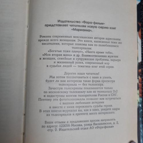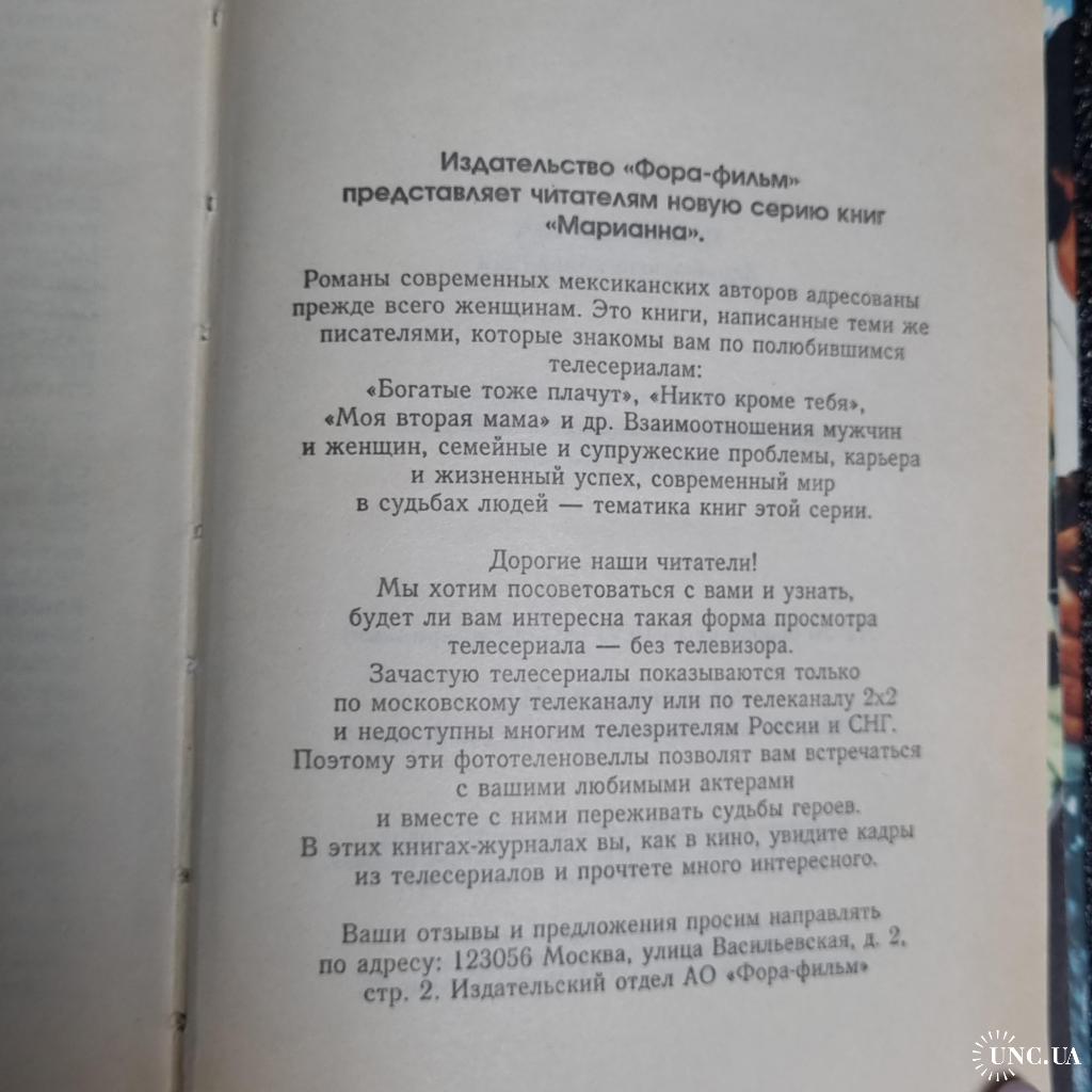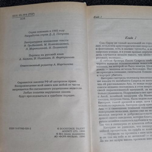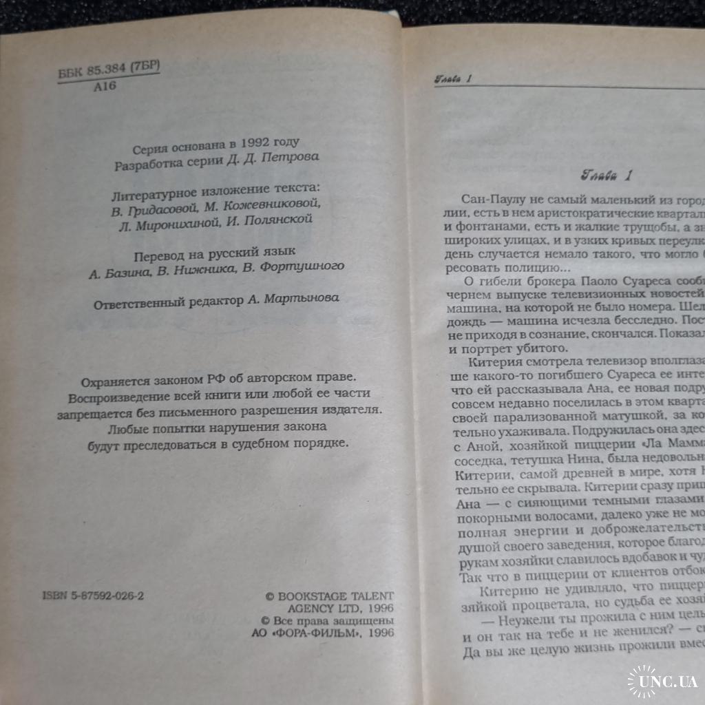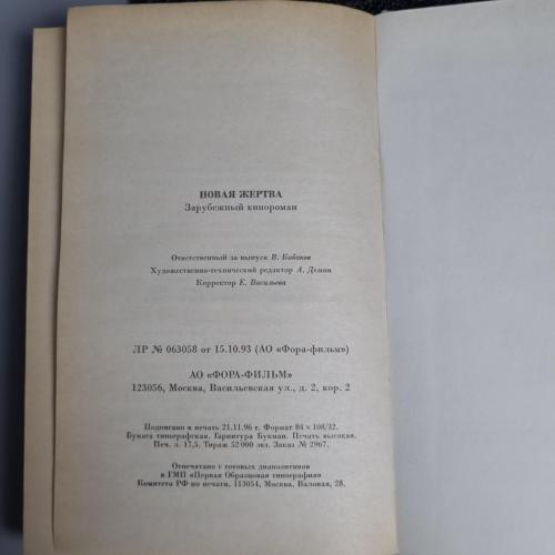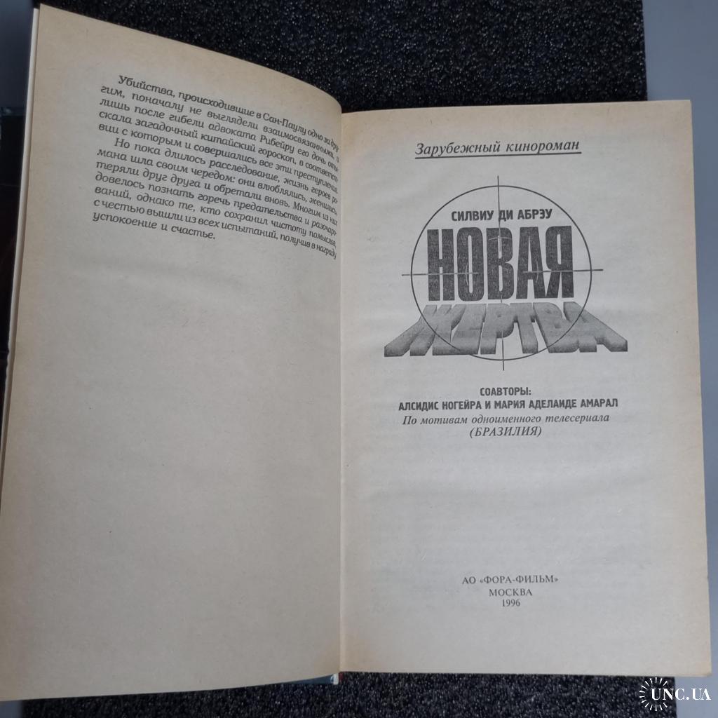 Роман за мотивами однойменного серіалу, Бразилія. 1996 р."Нова жертва"-це бразильський серіал 1995 року, який поєднує в собі елементи детективу, драми, криміналу, мелодрами й трилера. Історія розгортається навколо серійних вбивств, що відбуваються в Ріо-де-Жанейро.