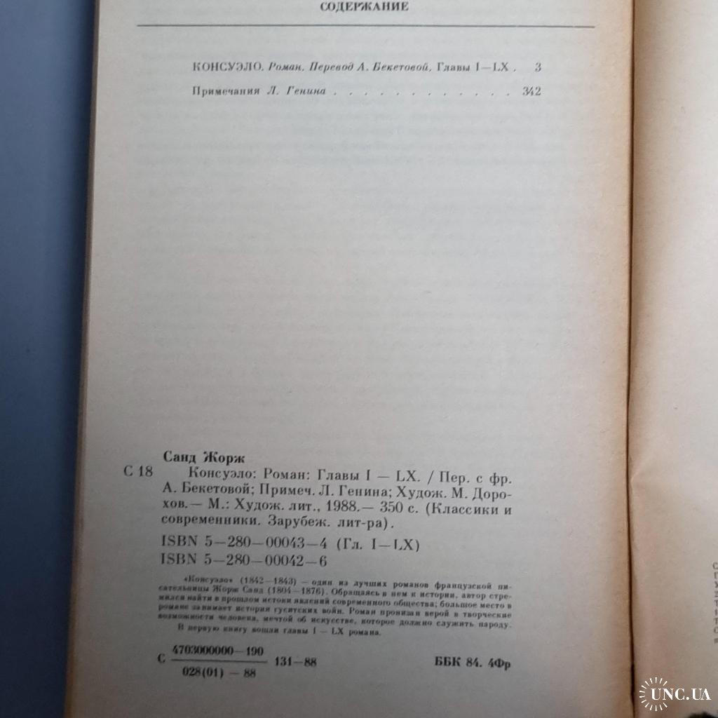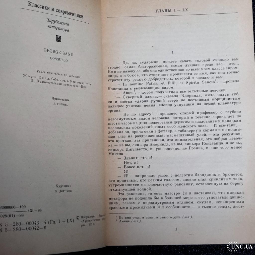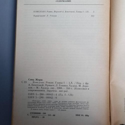 - Сюжет: «Консуело» (1843-1843) — один із найкращих романів французької письменниці Жорж Санд (1804-1876). Звертаючись у ньому до історії, автор прагнув знайти в минулому витоки явищ сучасного суспільства; велике місце в романі займає історія гуситських воєн. Роман пронизаний вірою в творчі можливості людини, мрією про мистецтво, яке має служити народу. До першої книги увійшли глави I – LX роману.