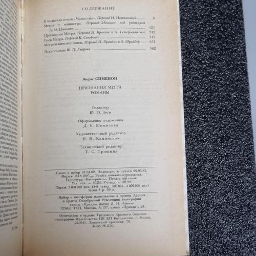 До збірника включено романи крупного представника детективного жанру в сучасній зарубіжній літературі Жоржа Сименона. Більша частина належить до серії про комісара кримінальної поліції Парижа Мегре, вони присвячені психологічному дослідженню людських характерів, що формуються в умовах буржуазного суспільства.