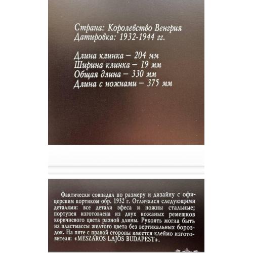 Кортик в хорошем состоянии, без реставрации, все детали родные, в ножнах не люфтит, кнопка работает хорошо. Ниже добавлю фото из каталога, все элементы, клейма полностью совпадают с представленным в каталоге образцом. Знаю что по Венграм существует очень много вопросов и мнений, поэтому выставлять на обсуждение не вижу смысла, сам пересмотрел кучу форумов и обсуждений, пусть покупатель сам делает для себя выводы. На фото все подробно показал, если есть вопросы задавайте, делайте обдуманные ставки. Кортики, сабли, ножи и кинжалы наложенным платежом не отправляю!!!☝️ (Любые дополнительные фото по требованию