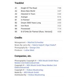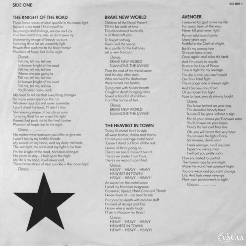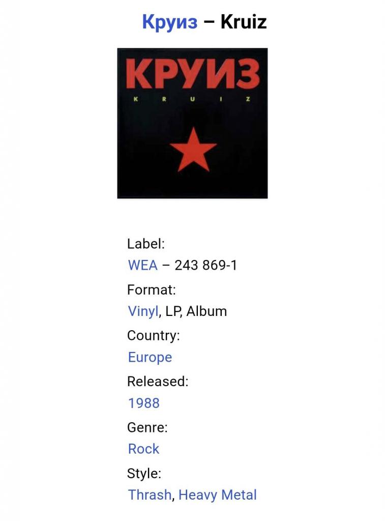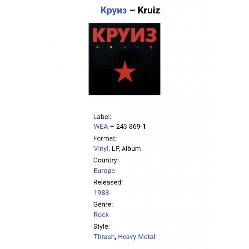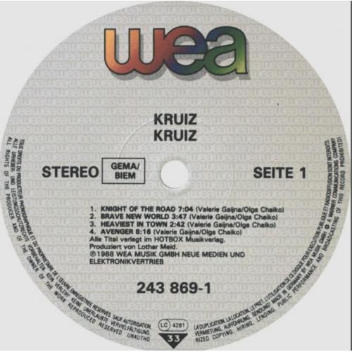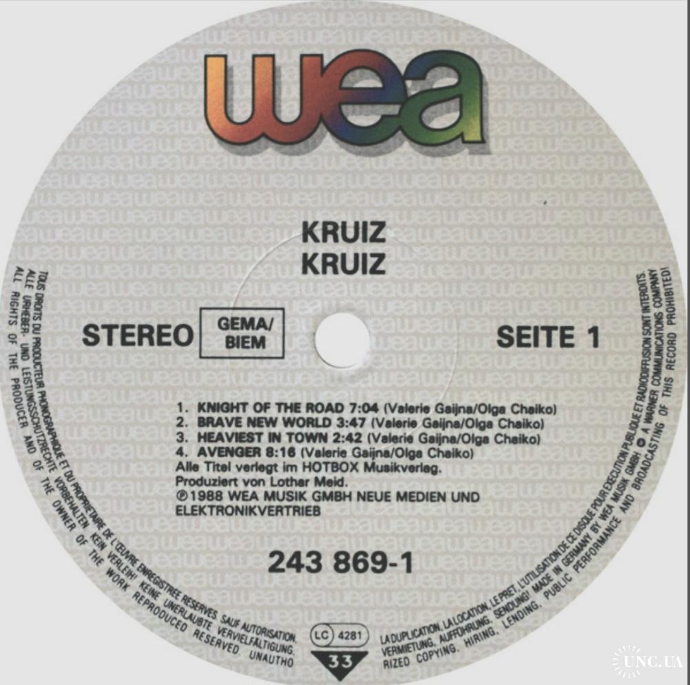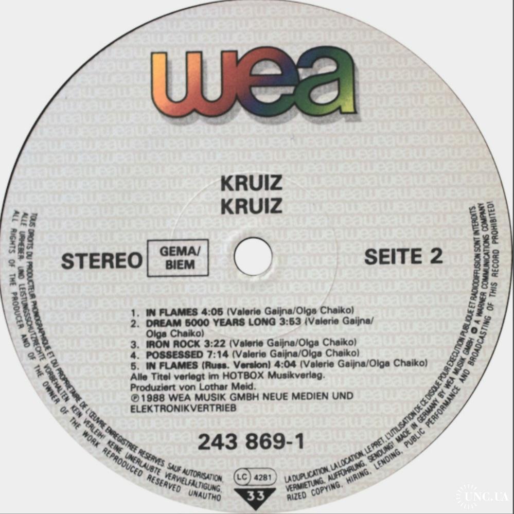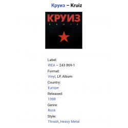 Вінілова платівка. Шостий, студійний альбом, в дискографії, російської (радянської) хард-рок, хеві метал, спід метал групи Круиз, яка складалась на той час з учасників Валерія Гаїни, Федора Васильєва та Сергія Єфімова (Kruize) 1988. Випуск фірми (Wea) Germany, 1988-ий рік. Оригінальне, першопресове Німецьке видання. Рідкісне (Rare). Стан платівки ЕХ+. Стан конверту ЕХ+. В наявності внутрішня вставка. Відправка по Україні службами доставки: Нова Пошта, Укр Пошта, Делівері. Також відправляємо посилки за кордон по цілому світу.