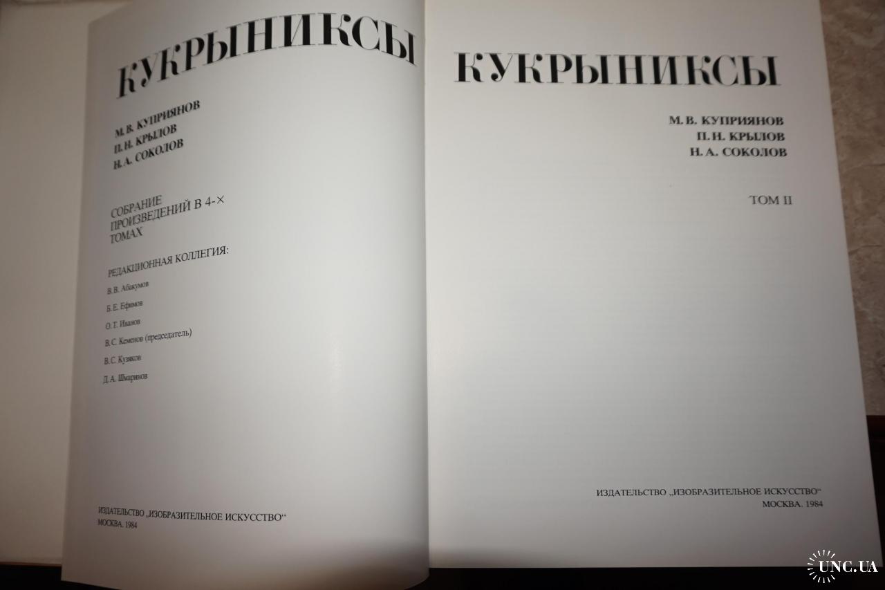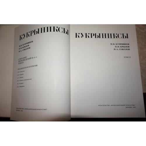 Публикуются произведения Кукрыниксов и рассказывается о совместном творчестве мастеров изобразительного искусства - М.В.Куприянова, П.Н.Крылова, Н.А.Соколова. Автор вступительной статьи В.С.Кеменов, составитель Н.И.Горянина (1982 г., Тираж 30000).