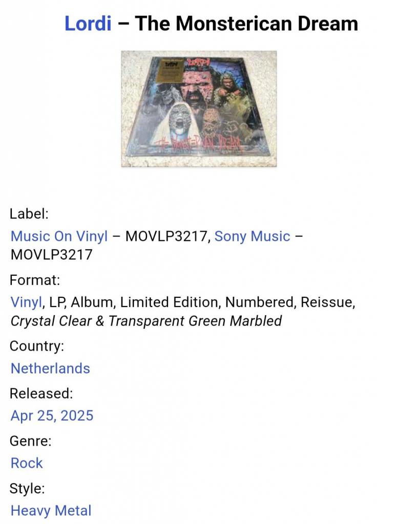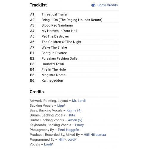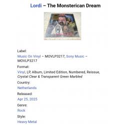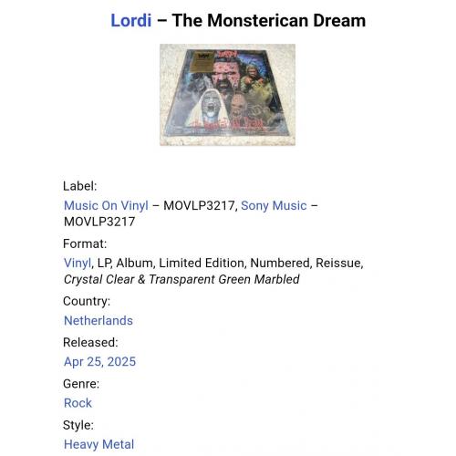 Вінілова платівка. Другий, в дискографії, студійний альбом, переможців Євробачення 2006-го року, Фінської (Англомовної) хард-рок, глем-метал групи Lordi (The Monsterican Dream) 2004. Випуск фірми (Music On Vinyl / Sony Music) Netherlands, 2025-ий рік. Кольоровий вініл (Coloured Vinyl). Прономероване видання. В комлекті багато сторінковий буклет. Лімітований тираж (Limited Edition). Нове, запаковане. Категорія S/S. Відправка по Україні службами доставки: Нова Пошта, Укр Пошта, Делівері. Також відправляємо посилки за кордон по цілому світу.