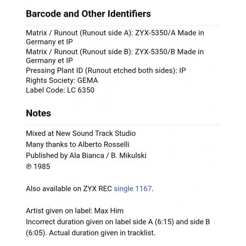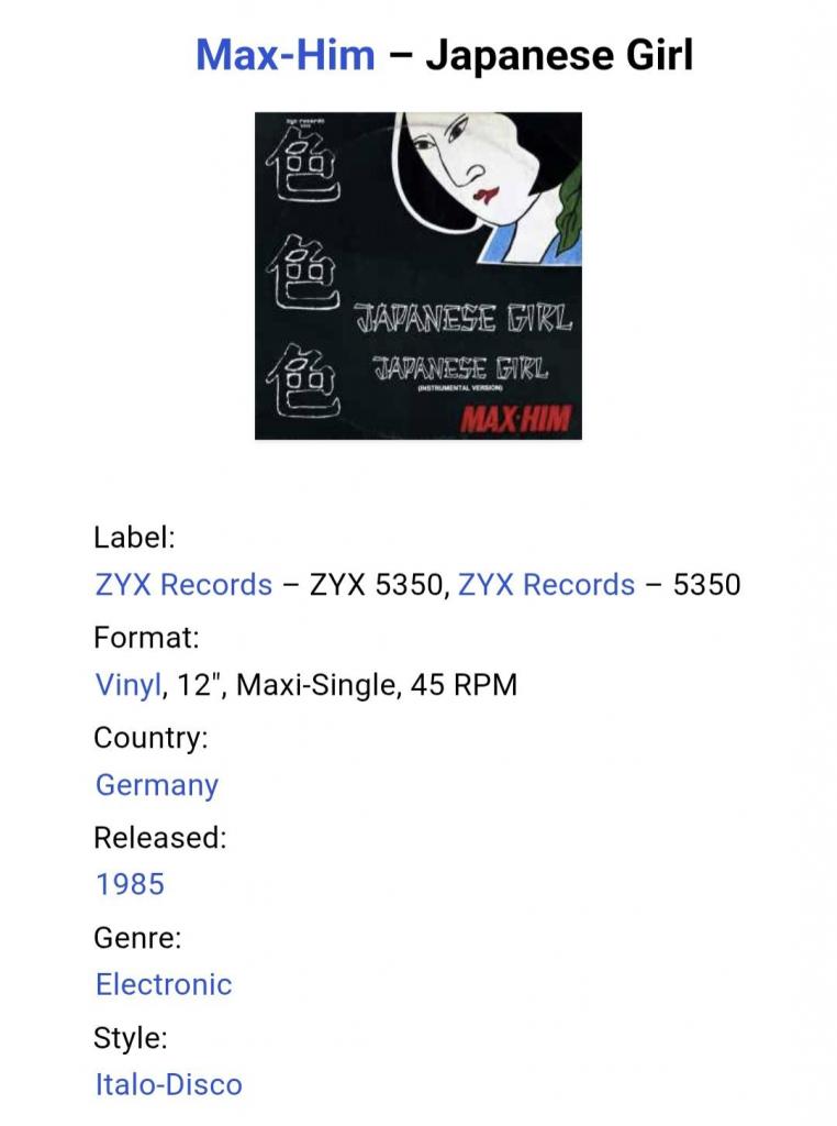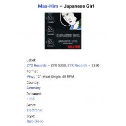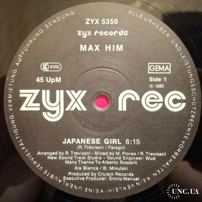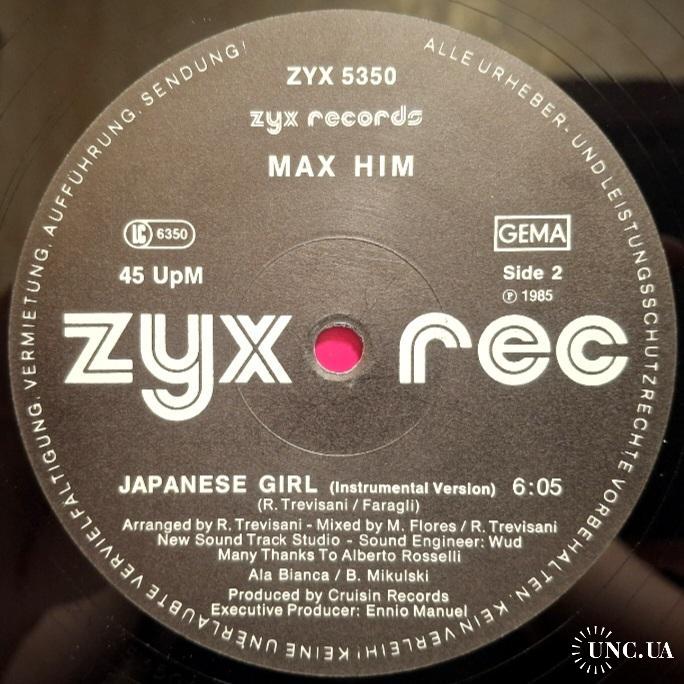 Вінілова платівка. Третій, в дискографії, студійний максі сингл (ЕР 12), Італійської поп-групи стилю італо диско, Max-Him, до складу якого входили Флоріан Фадінгер та Массімо Ваккарі (Japanese Girl) 1985. Випуск фірми (Zyx Music) Germany, 1985-ий рік. Оригінальне, першопресове Німецьке видання. Стан платівки EX+. Конверт ламінований. Стан конверту ЕХ+. Відправка по Україні службами доставки: Нова Пошта, Укр Пошта, Делівері. Також відправляємо посилки за кордон по цілому світу.