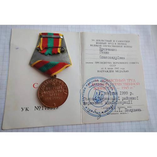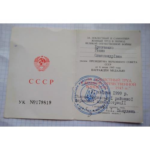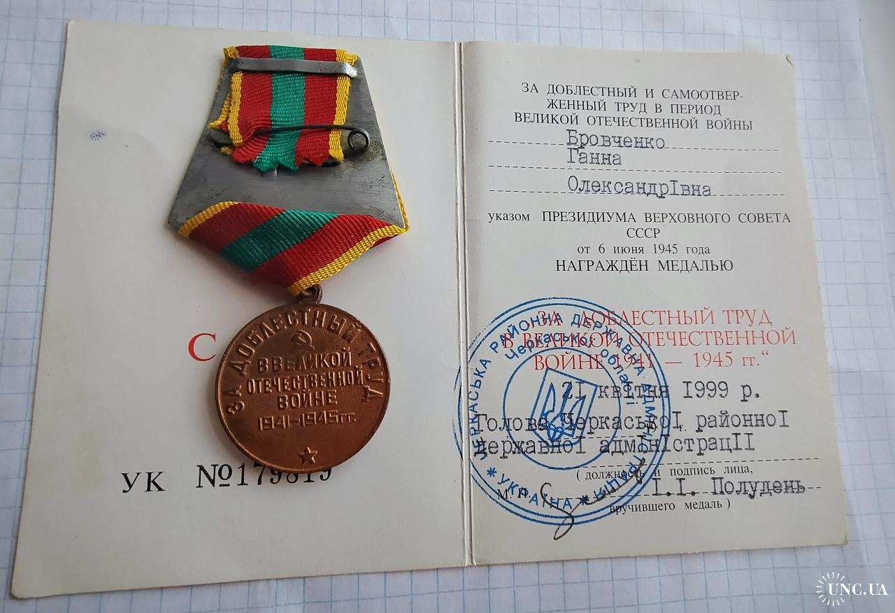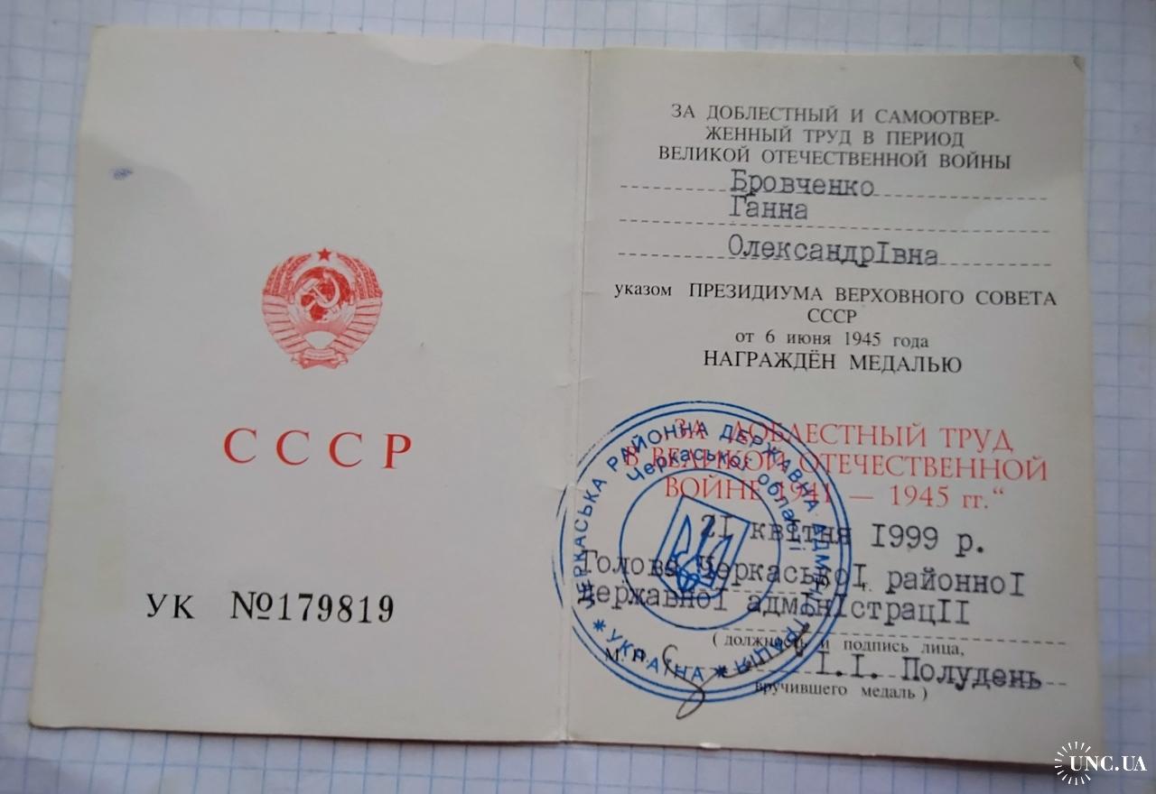 1941-1960Медаль вручена 21 квітня 1999р.Черкаська область.Посвідчення з символікою СРСР ,а печать з гербом України.