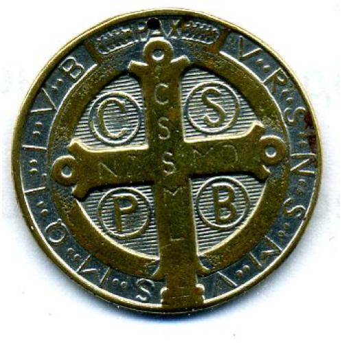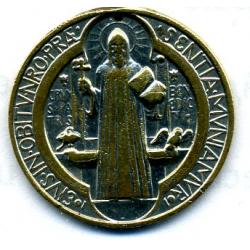 Святий Бенедикт - улюблений символ ранніх християн. Медальйон використовують як захист для себе та своєї власності. Виготовлений , приблизно, у 1960 році, мідний, покритий серебром. З часом серебро місцями стерлось. Діаметр - 26 мм, товщина-1 мм, вага - 6 гр.