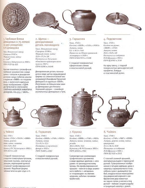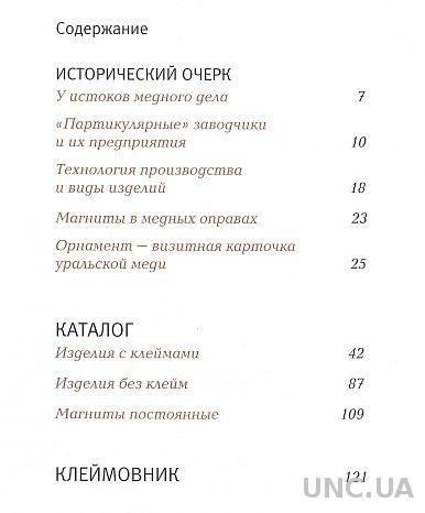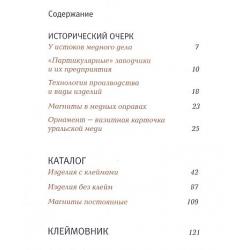 В издание включена краткая история и расцвета медного дела на Урале в первую эпоху правления Елизаветы и Екатерины II; приведены сведения об отдельных предприятиях, выпускаемых ими видах изделий, материале, технике, а также особенностях орнамента.