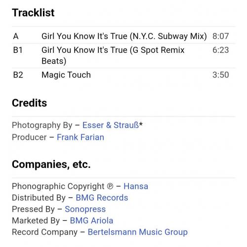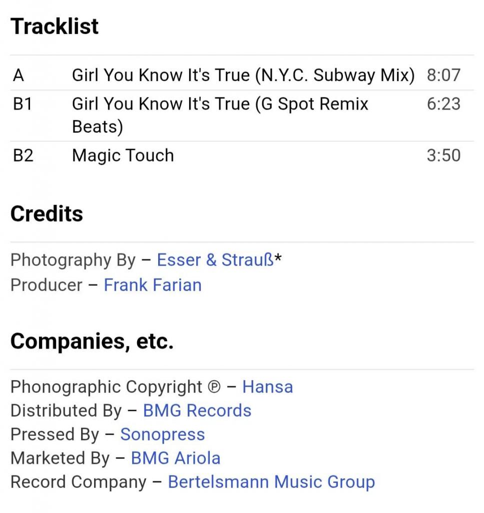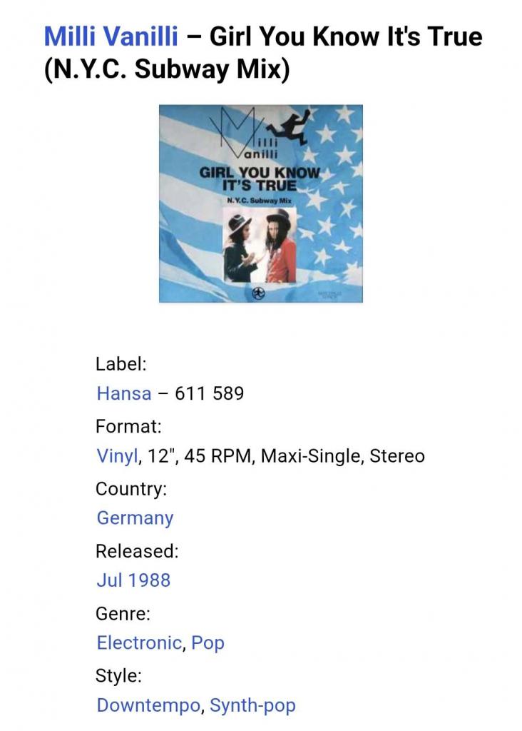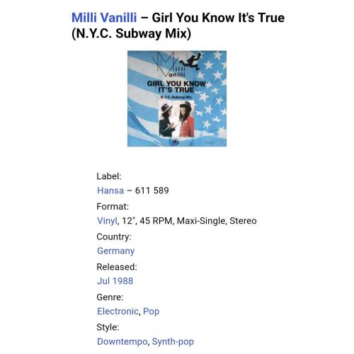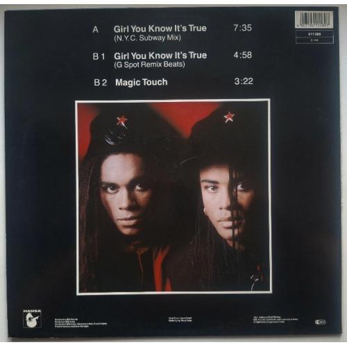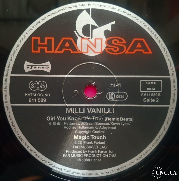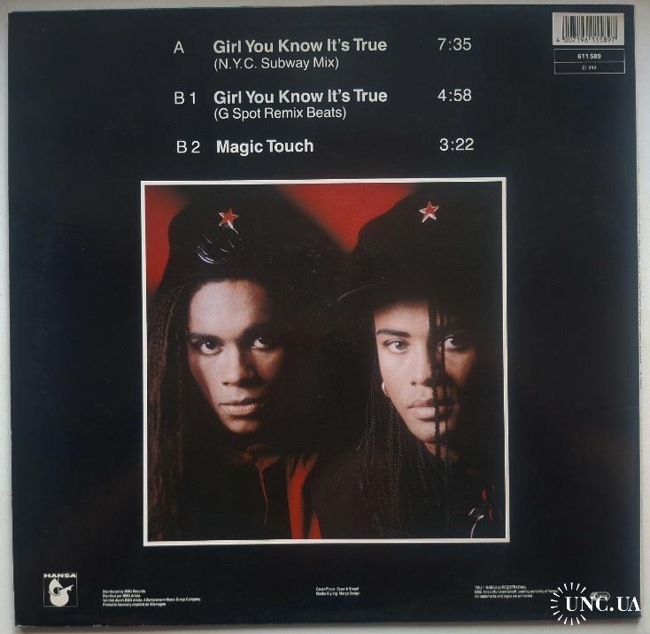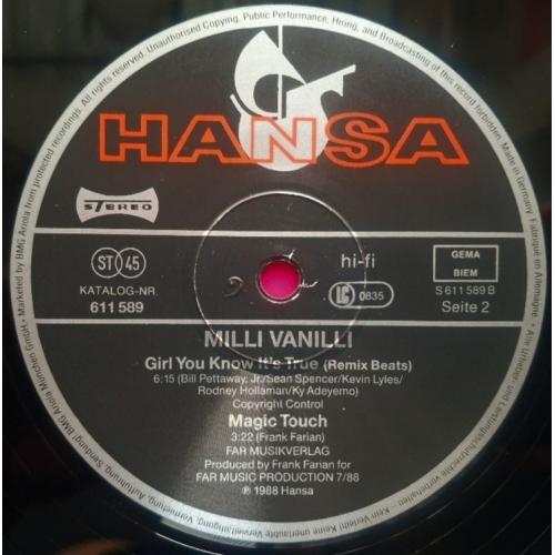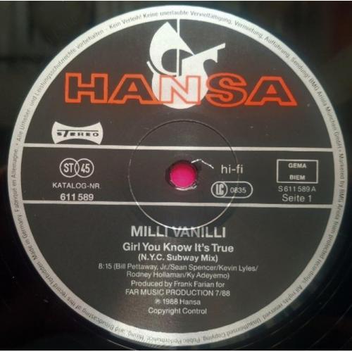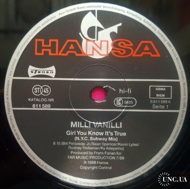 Вінілова платівка. Перший, дебютний, в дискографії, студійний максі сингл (ЕР 12), самого скандального із за афери Німецького електронік, фанк, соул, хіп-хоп, європоп дуету Milli Vanilli, до складу якого входили Феб Морван і покійний вже Роб Пілатус (Girl You Know It's True. N.Y.C. Subway Mix) 1988. Випуск фірми (Hansa) Germany, 1988-ий рік. Оригінальне, рідне, першопресове Німецьке видання. Стан платівки EX+. Конверт глянцевий. Стан конверту ЕХ+. Відправка по Україні службами доставки: Нова Пошта, Укр Пошта, Делівері. Також відправляємо посилки за кордон по цілому світу.