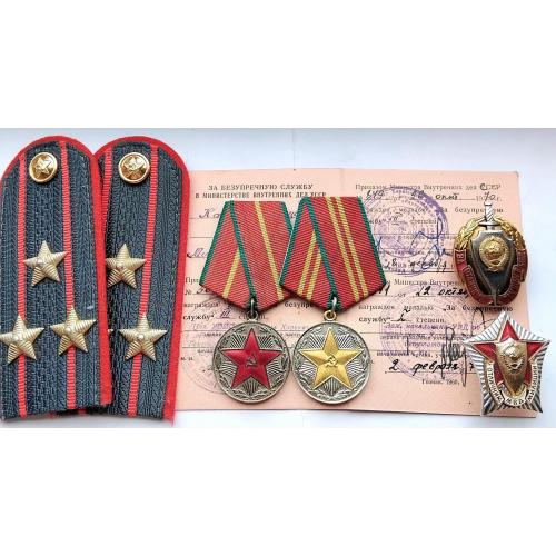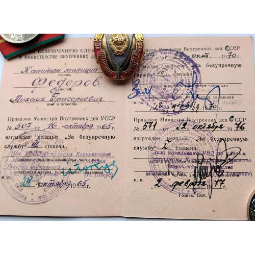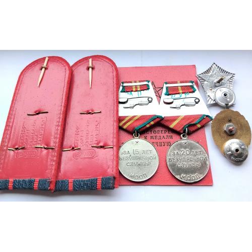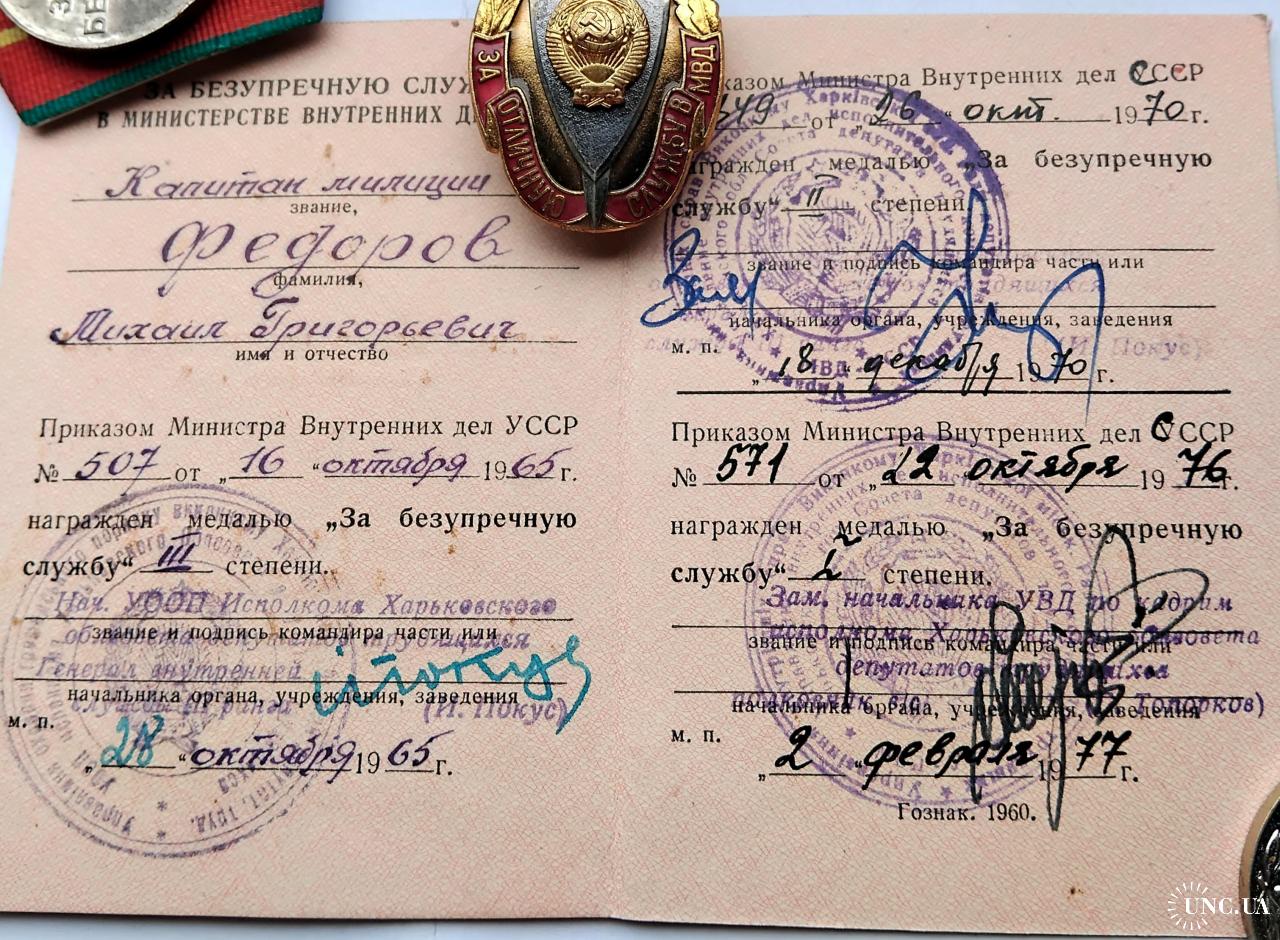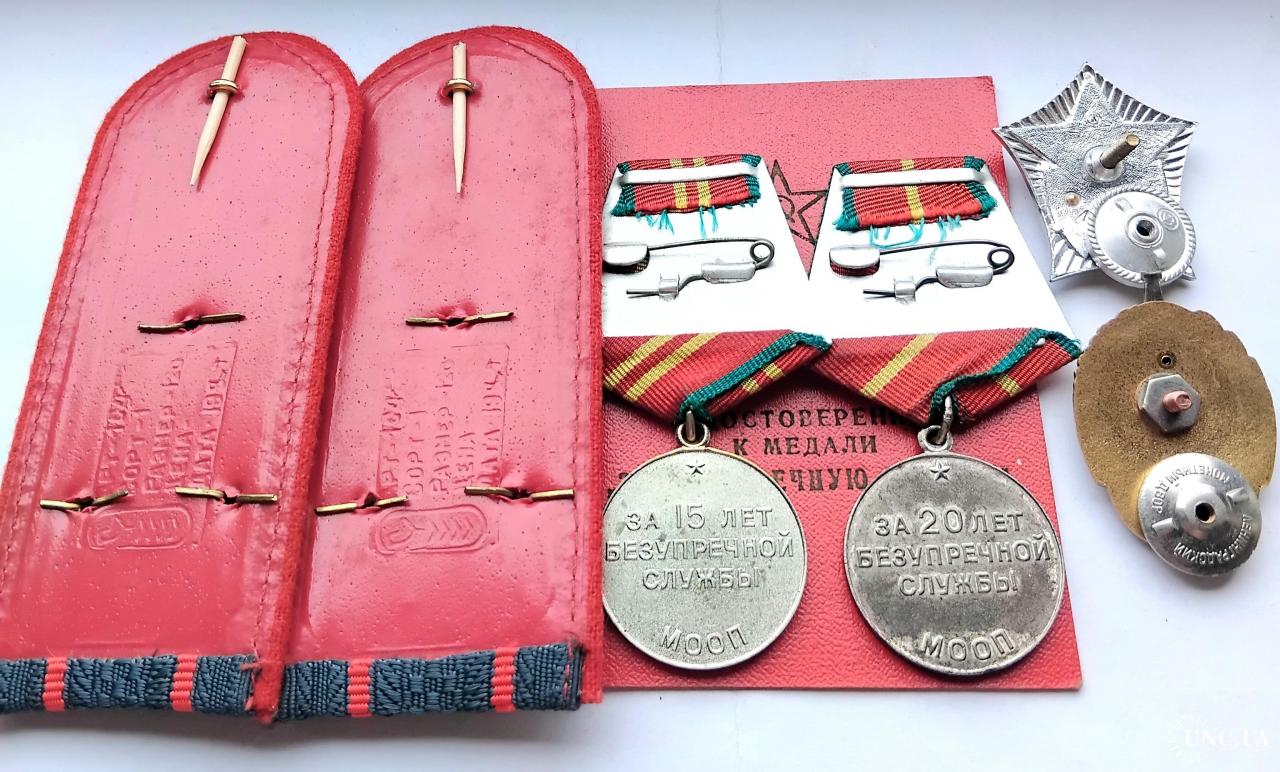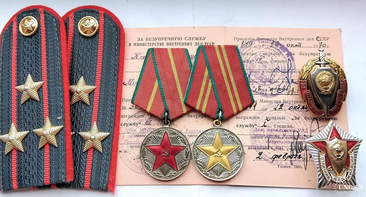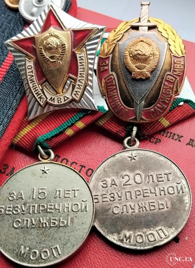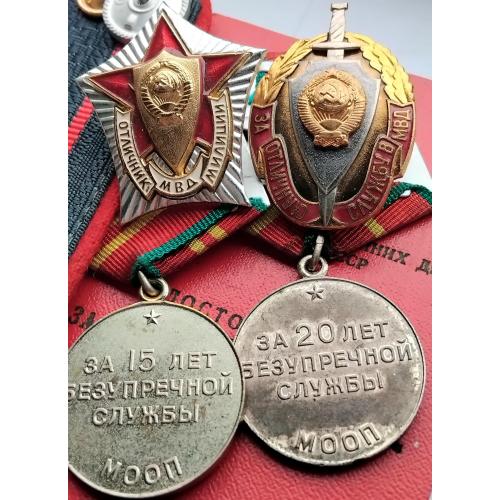 1961-1980☝️'Министерство Охраны Общественного Порядка' МООП..'За безупречную службу МООП' 1 и 2 ст..отличный родной сбор,на 1 ст. промзвено запаяно фабричной пайкой,ленты родные муаровые булавки целые.Знак 'За отличную службу в МВД' тяжёлый,разборной,резьба в порядке,гайка родная.'Отличник Милиции' новый.Док в наличии,не рванный и не исписаный детской писаниной.'УООП' по Харьковской обл.1965-1976г.Погоны полковника МВД покупателю в качестве бонуса.