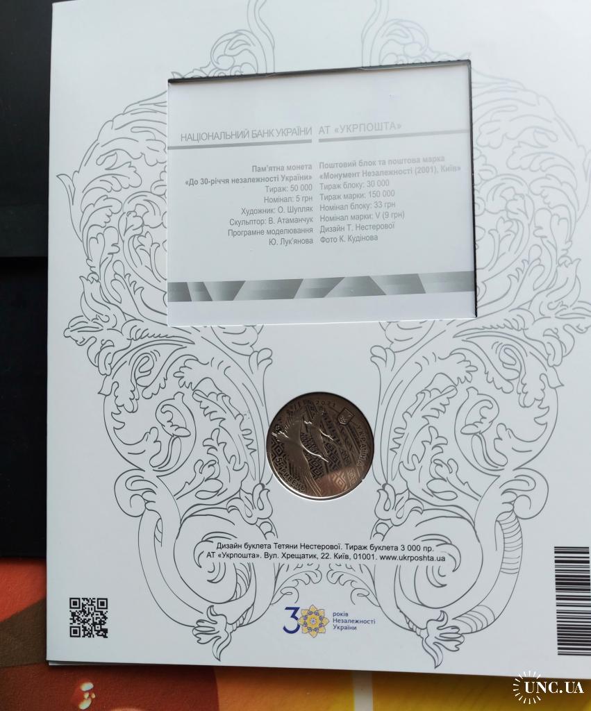 Україна 5 гривень 2021 р., Набір до 30-річчя Незалежності України - монета, блок, марка