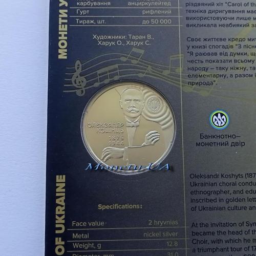 Пам’ятна монета присвячена видатному українському хоровому диригенту, композитору, етнографу та педагогу Олександру Кошицю (1875–1944), який відіграв ключову роль у популяризації української музичної культури на міжнародній арені. Пам’ятна монета вшановує творчу спадщину митця, який на запрошення голови Директорії УНР Симона Петлюри очолив Українську республіканську капелу. Упродовж 1919–1924 років під керівництвом Олександра Кошиця капела здійснила гастрольне турне 17 країнами світу, давши понад 600 концертів. Саме тоді світ уперше почув “Щедрика” Миколи Леонтовича – твір, що згодом став всесвітньо відомим різдвяним хітом “Carol of the Bells”.
