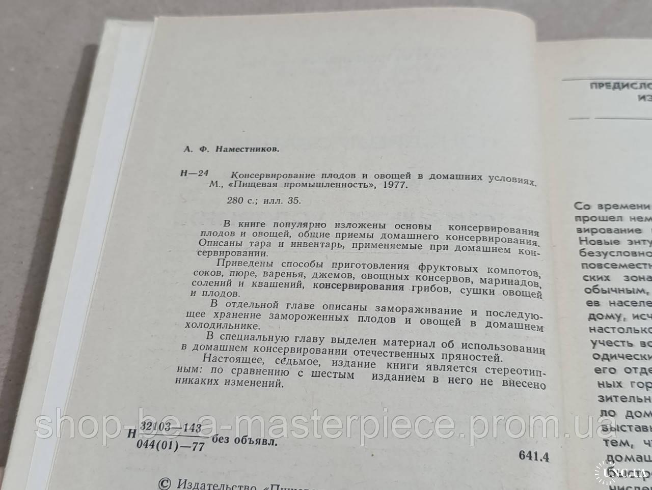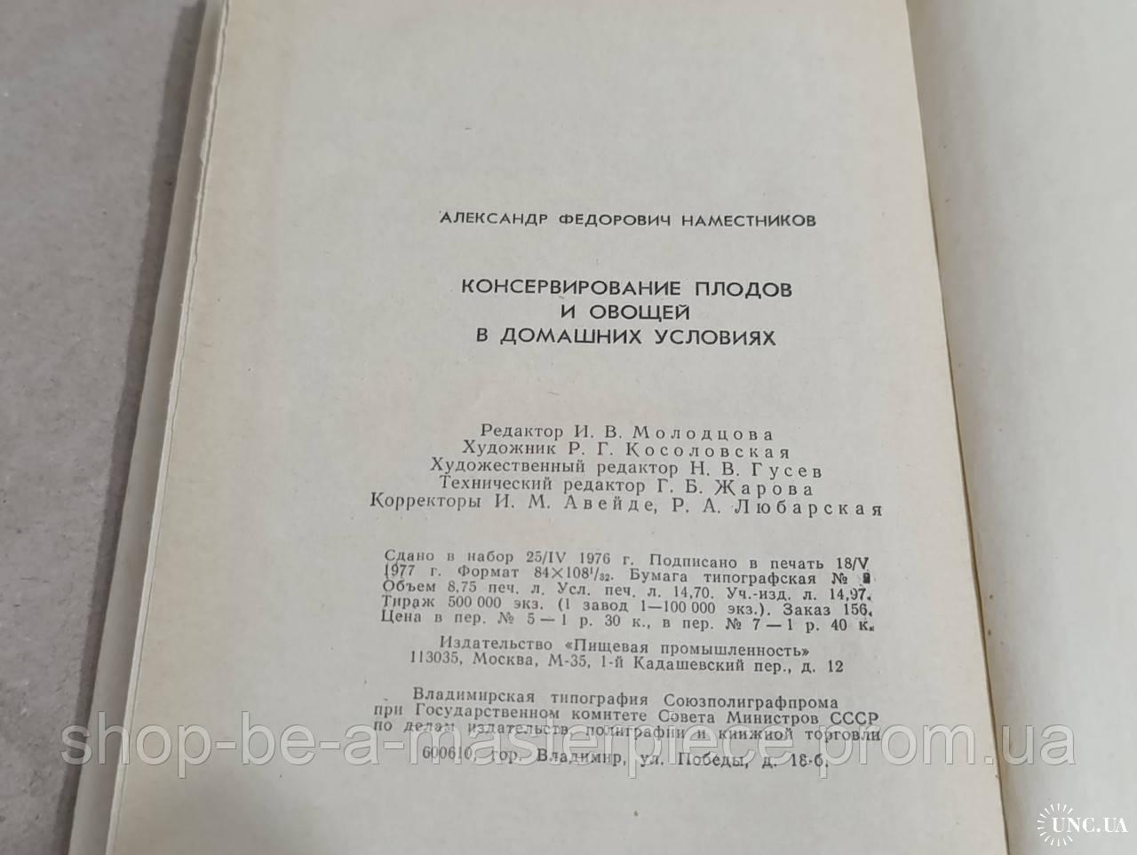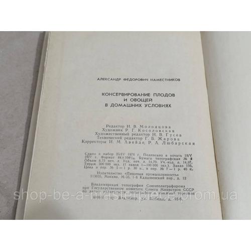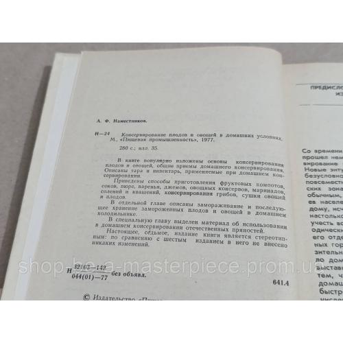 Наместников, А.Ф. Консервирование плодов и овощей в домашних условиях 1977 твердый переплет. идеальное состояние Издательство «Пищевая промышленность», М., 1977г. Формат 84х108/32, язык русский, 280 стр. с иллюстрациями, переплёт твёрдый. Состояние хорошее. В книге популярно изложены основы консервирования плодов и овощей, общие приемы домашнего консервирования, описаны тара и инвентарь,применяемые для домашнего консервирования. Приготовление варений, маринадов , солений, способы приготовления грибов и сушки плодов и овощей. В издании введена новая глава о замораживании и последующем хранении продуктов с использованием домашнего холодильника. Для широкого круга читателей.Ответы продавца на ваши вопросы