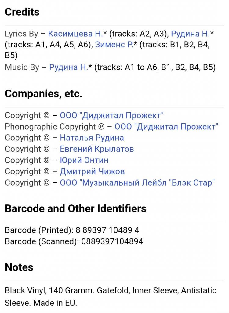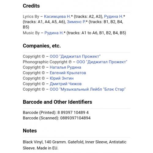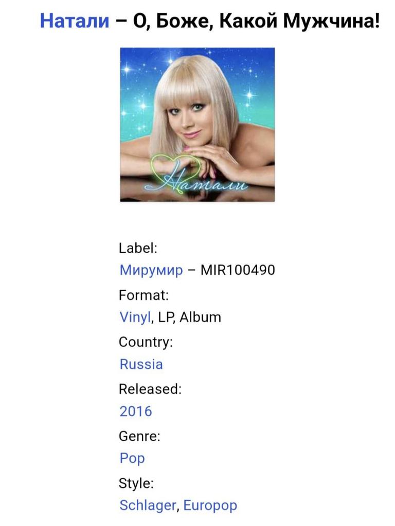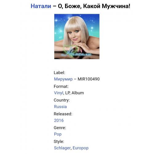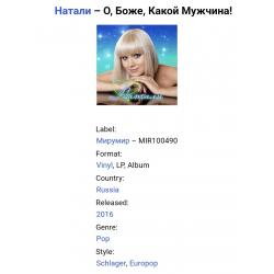 Вінілова платівка. Десятий, в дискографії, студійний альбом, російської (радянської) поп-шлягер виконавиці, бувшої учасниці групи Поп-Галактика, Наталії Рудіної (Міняєвої) більше відомої під скороченим ім,ям Наталі (О Боже, Какой Мужчина!) 2016. Випущено фірмою (MiruMir) Russia, в 2016-му році. Виготовлено в Європі. Оригінальне, першопресове видання. Лімітований тираж (Limited Edition). Нове, запаковане. Категорія S/S. Відправка по Україні службами доставки: Нова Пошта, Укр Пошта, Делівері. Також відправляємо посилки за кордон по цілому світу.