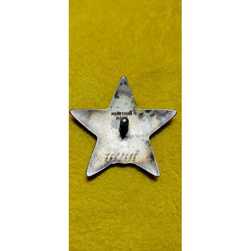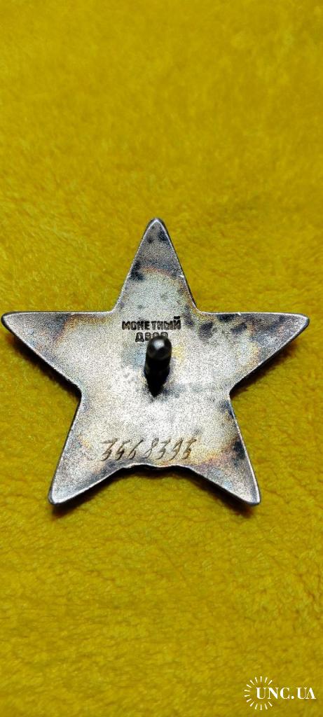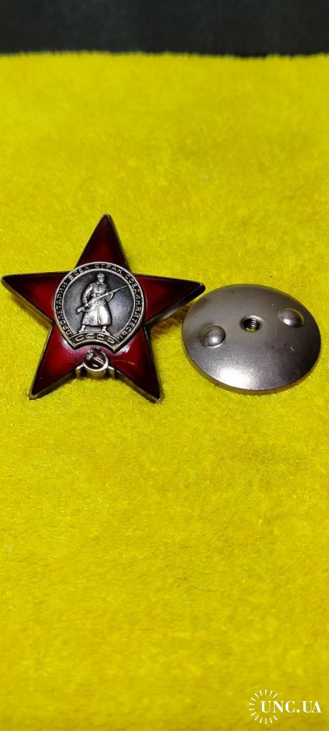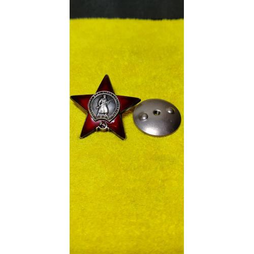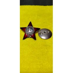 1941-1960Представляет собой покрытую рубиново-красной эмалью пятиконечную звезду. В центре расположен щит с рельефным изображением красноармейца в шинели и буденовке с винтовкой наперевес. Вокруг изображения солдата по окружности расположена надпись «ПРОЛЕТАРИИ ВСЕХ СТРАН, СОЕДИНЯЙТЕСЬ!», а внизу — надпись «СССР» с изображением серпа и молота. состояние очень хорошие. сколов трещин нет. винт в полном порядке .есть небольшие следы времени.