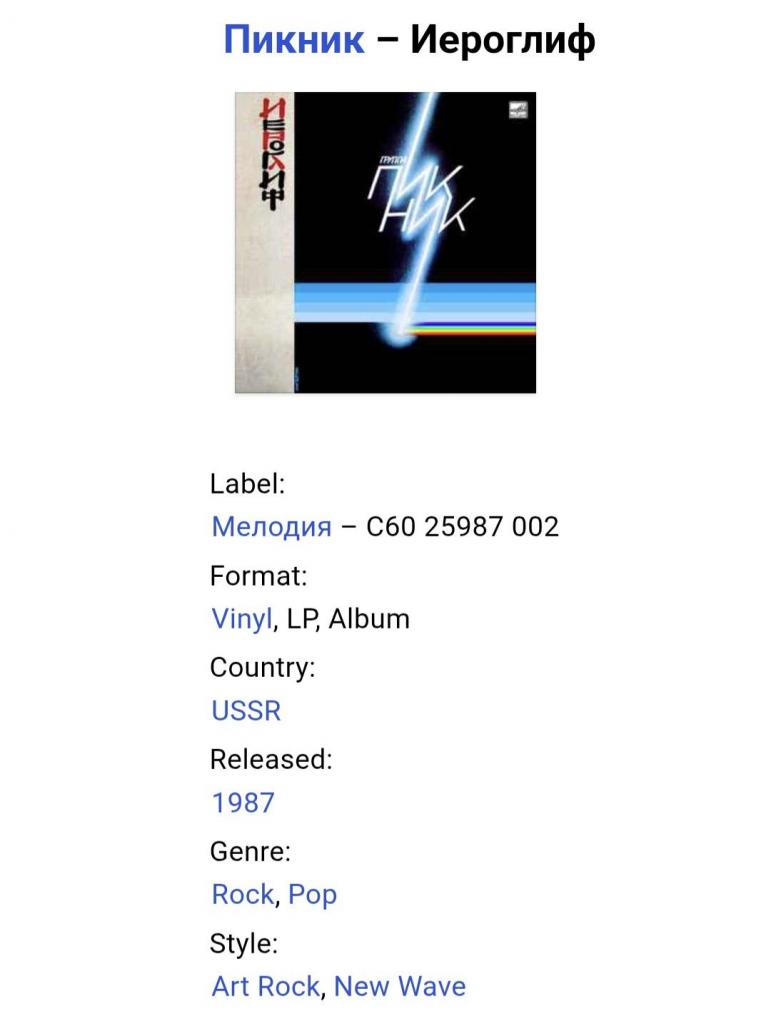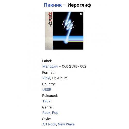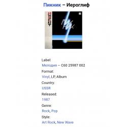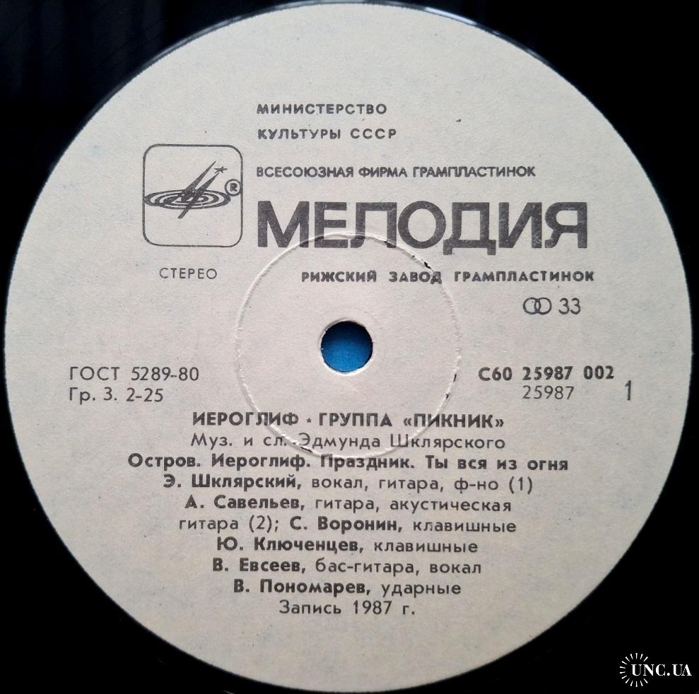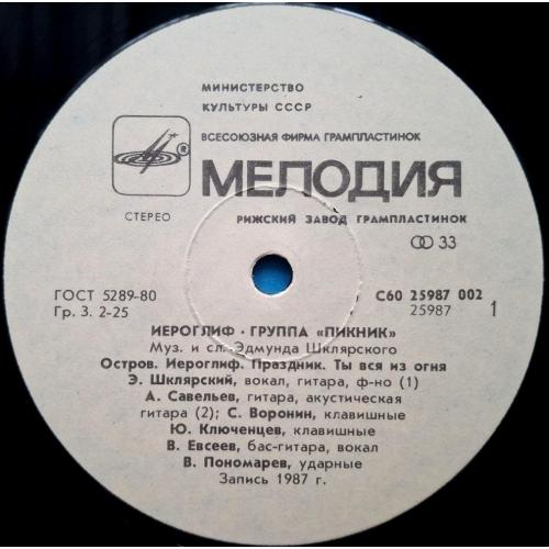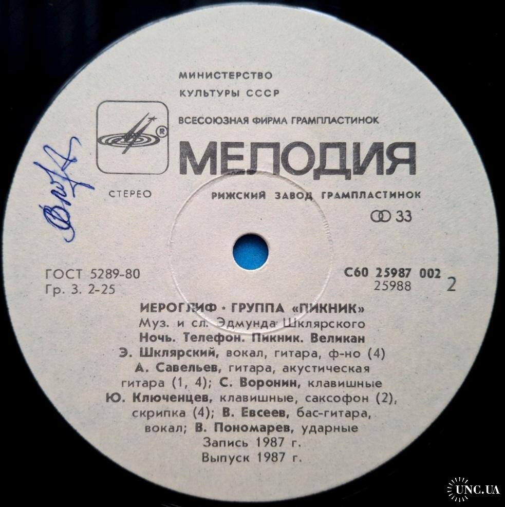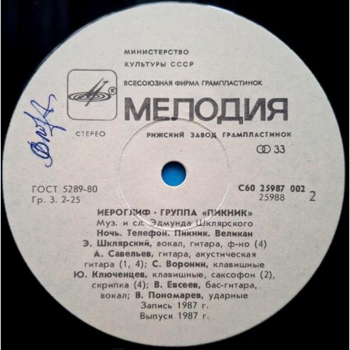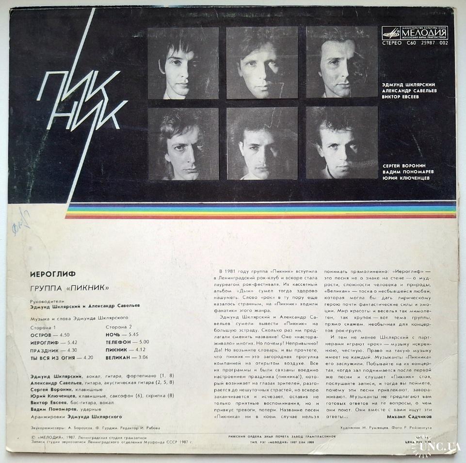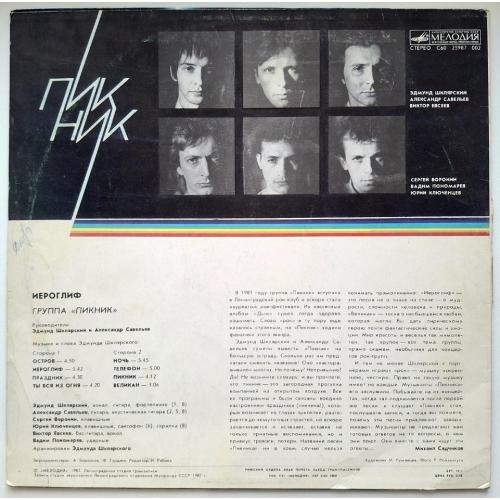 Вінілова платівка. Третій, в дискографії, студійний альбом російської (радянської) арт-рок, інді-рок групи нової хвилі, Пікнік, до складу якої входили Едмунд Шклярський, А. Савельєв, С. Воронін, Ю. Ключенцев, В. Євсєєв та В. Пономарьов (Иероглиф) 1987. Випуск фірми (Мелодія) СРСР, Рижський завод грамплатівок (Латвія) 1987-ий рік. Оригінальне, першопресове Латвійське видання. Стан платівки ЕХ. Стан конверту ЕХ-. Відправка по Україні службами доставки: Нова Пошта, Укр Пошта, Делівері. Також відправляємо посилки за кордон по цілому світу.