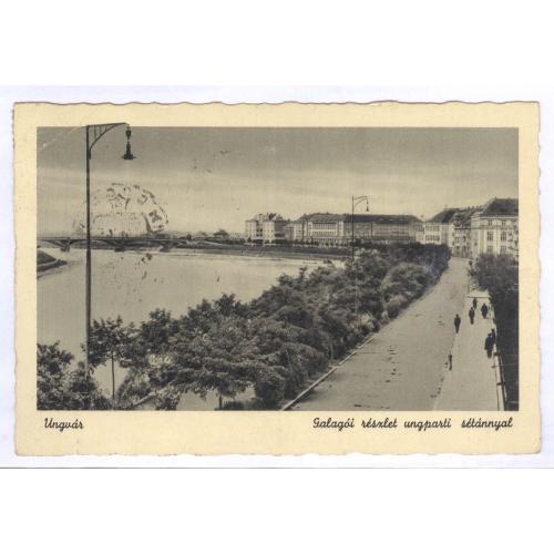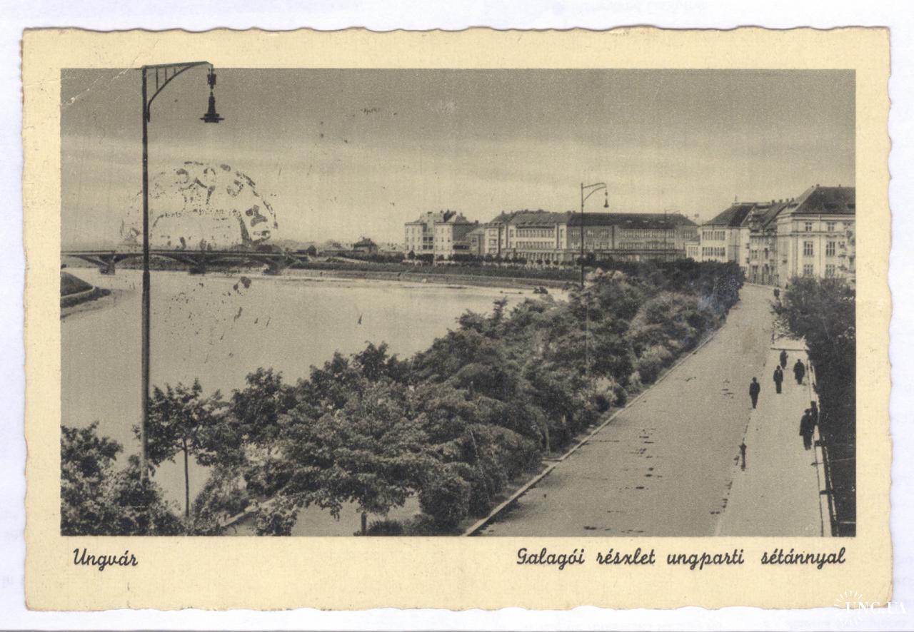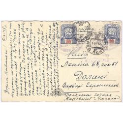Открытка "Ужгород. Вид на речку Уж" ( "Unghvár, Galagoi reszlet ungparti setannyal" ) отправлена 5 октября 1945 года в Киев на улицу Ленина 68 Варваре Долине из Ужгорода готель "Берченій". Оплачено двумя сине-красными марками первого стандартного выпуска Закарпатской Украины номиналами по 100. Имеются оттиски штемпелей: " Закарпатская Украина" - синий, "Просмотрено Военной цензурой" - синий, "Киев почтамт 14.10.45" - черный.