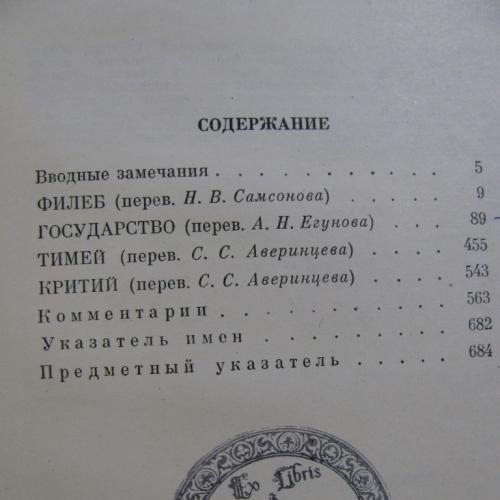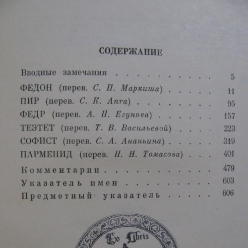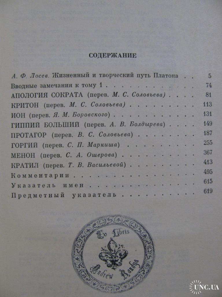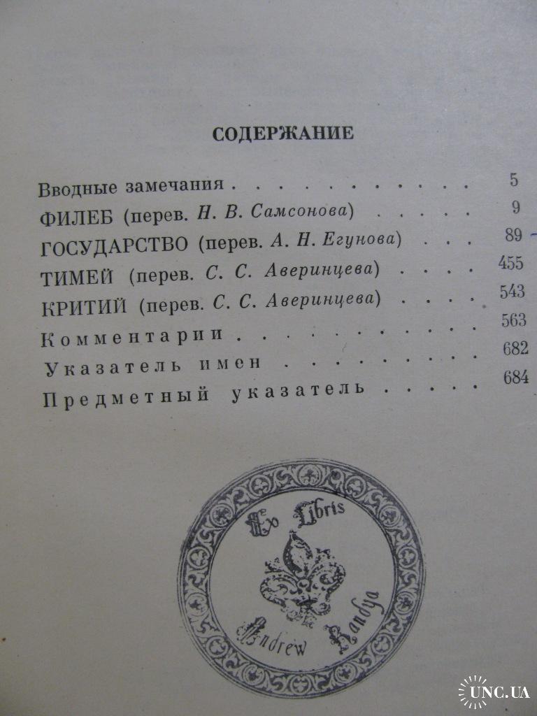 Данный комплект будет интересен коллекционерам-библиофилам: эти 4 книги сочинений ПЛАТОНА с экслибрисом, имеющим коллекционную ценность. О втором владельце данного комплекта свидетельствует автентичный оттиск на титулах гербового экслибриса с надписью: «Ex Libris Andrew Kandya» и с изображением королевской лилии в обрамлении короны. Этот художественный экслибрис в узкой среде настоящих книголюбов имеет коллекционную ценность, ведь уже давно стал символом знака качества букинистических изданий не только в Украине, но и во многих зарубежных странах.