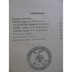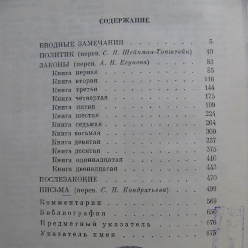 Во вторую книгу третьего тома (1972 г.) входят произведения позднейшего периода его творчества: диалог "ПОЛИТИК", в котором разрабатывается тема идеального правителя, обширные по объему "ЗАКОНЫ", в которых продолжается начатая в «ГОСУДАРСТВЕ» тема социальной утопии, и "ПОСЛЕЗАКОНИЕ". В том вошли также "Письма", рисующие личность философа. Приложение к этому последнему тому включает две работы авторов-неоплатоников и эпиграммы, приписываемые Платону, а также обширный научно-справочный аппарат: Библиографию ПЛАТОНА ( на 20 страницах!) , предметный и именной алфавитные указатели.