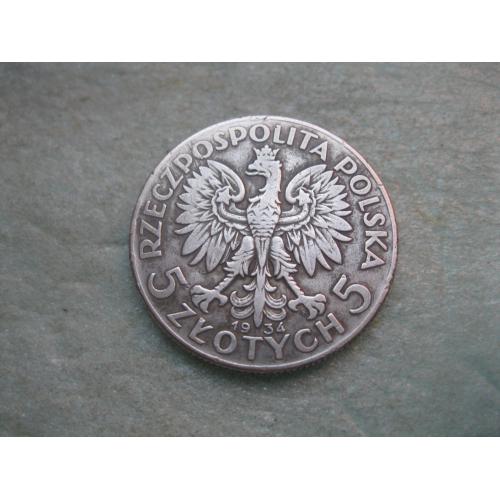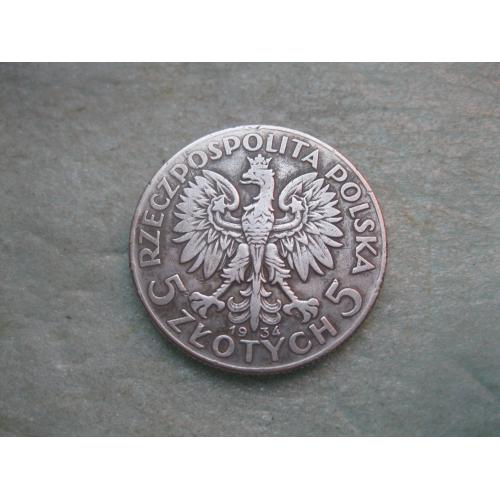 ОригиналПольша 5 злотых 1934 г. "Ядвига" . "Голова полонии" .Серебро 750 проба. Оригинал.. Хороший сохран.Отметка монетного двора. Варшава.Оригинал. Состояние по фото.Червоні риски на фото несподіваний фотоефект, насправді нічого червоного у монети нема.