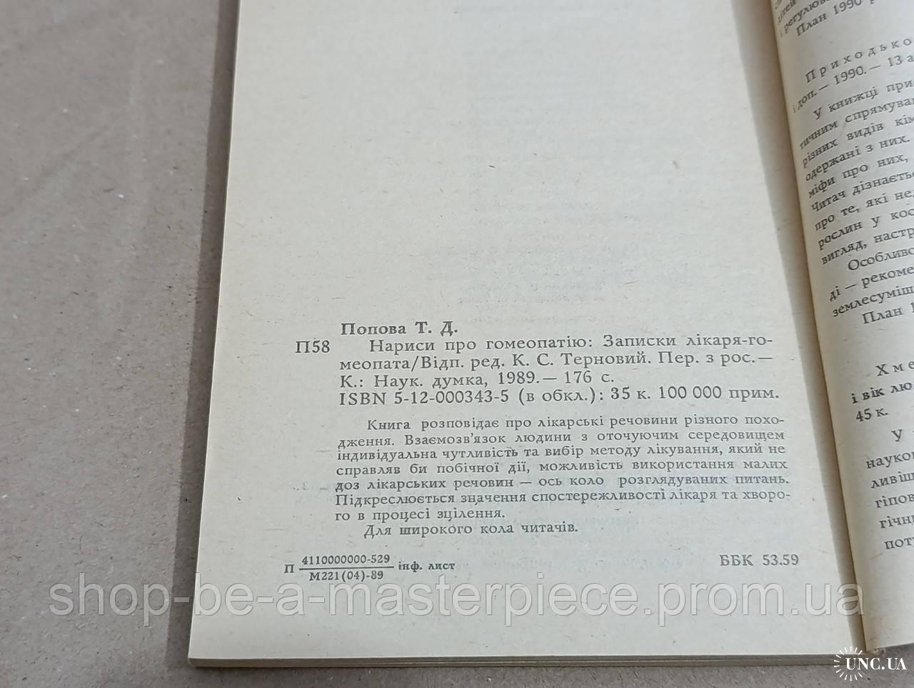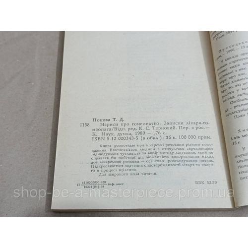 Попова Т. Д. Очерки о гомеопатии 1989 мягкая обложка. отличное состояние Записки врача-гомеопата/Веп. ред. К. С. Терновой. Пер. из рус. -К.: Наук. мысли, 1989. - 176 с. Книга рассказывает о лекарственных веществах различного происхождения. Взаимосвязь человека с окружающей средой индивидуальная чувствительность и выбор метода лечения, который не избавлял бы от побочного действия, возможность использования малых доз лекарственных веществ вот круг разрешенных вопросов. Подчеркивается значение наблюдательности врача и больного в процессе исцеления. Для широкого круга читателей.Ответы продавца на ваши вопросы