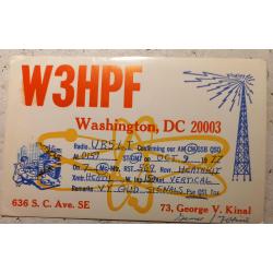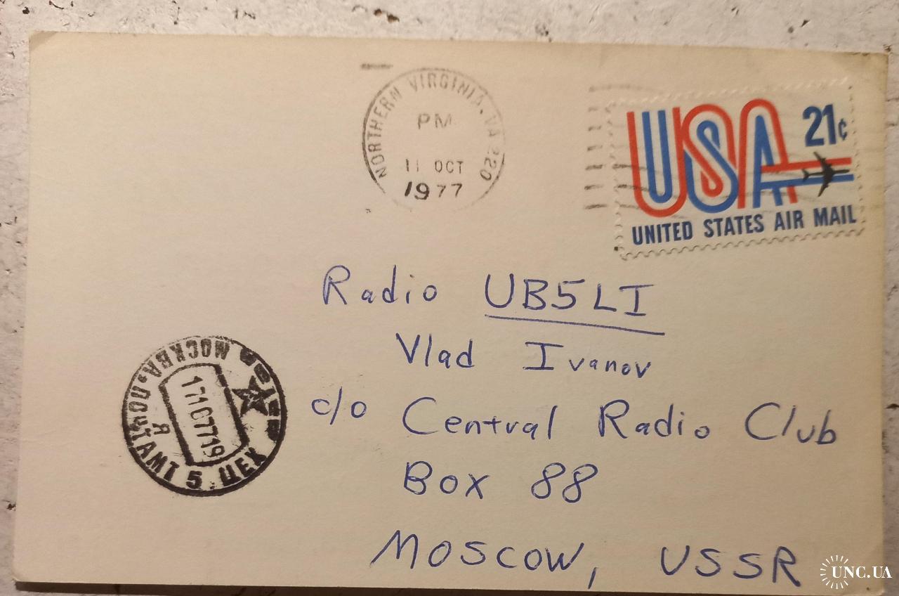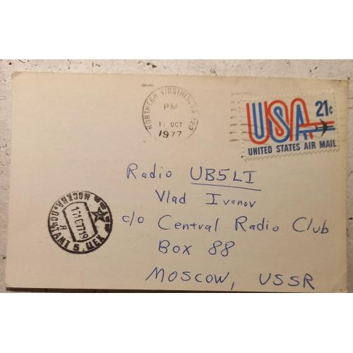 На лицевой стороне имеются данные радиообмена в эфире и стилизованные рисунки любительской радиорубки и антенны. Внизу локация американца и традиционные «73» (Наилучших пожеланий!). На обратной стороне – реквизиты почтовой пересылки: штамп из места отправки открытки (Сев. Вирджиния) + почтовая марка авиапересылки, а также штамп места получения) Москва (Центральный радиоклуб СССР). Любопытно, что время пересылки карточки составило 6 дней. Такой срок, несмотря на АВИА заставляет задуматься о сложностях преодоления «железного занавеса». Сколько еще нюансов может заметить пытливый аналитик (lol)! Для лиц, коллекционирующих города и локации мира, карточка может представлять интерес для пополнение списка такой коллекции. Карточка без дефектов. Состояние отличное.