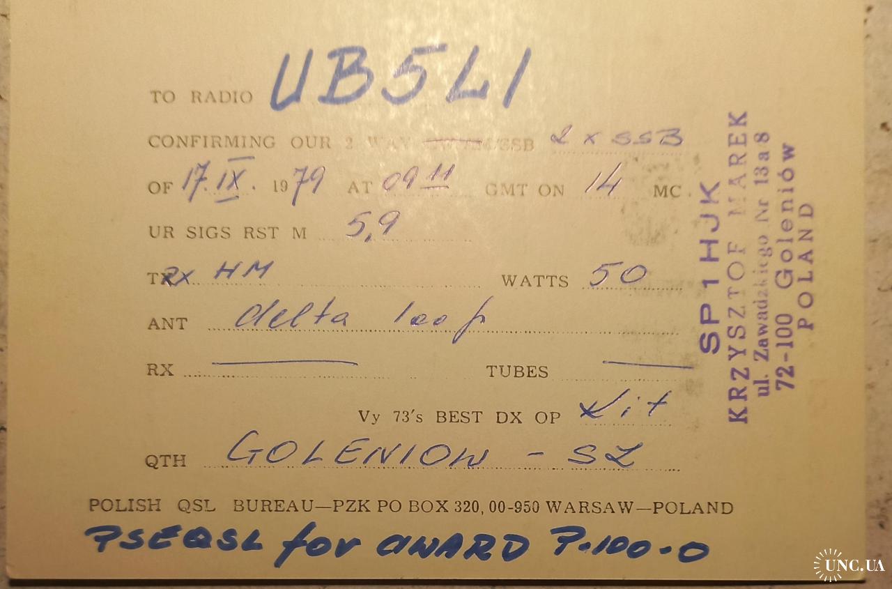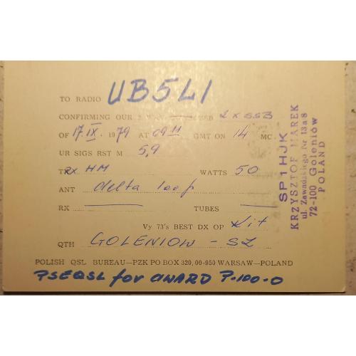 На лицевой стороне типового бланка польской QSL-карточки изображена эмблема Народного Войска Польского (Ludowe Wojsko Polskie).В период 1943–1989 годов этобыл «Пястовский орёл» — серебряный орёл без короны (так называемый «безкоронный орёл») на красном щите, часто изображаемый с опущенными крыльями. Этот символ символизировал связь с польской историей, но без монархической атрибутики, принятой в социалистической Польше. В данном случае отмечается юбилей 1943-1978 гг. Внизу стоит штамп позывного-сигнала польского радиолюбителя Кшиштофа. Слева от него размещена эмблема LOK в Польше -это Liga Obrony Kraju (Лига защиты родины), общественная организация, образованная в 1953 году (ранее — Лига друзей солдата). Она занимается вопросами национальной обороны, стрелковым спортом, обучением водителей и техническими видами спорта. Это аналог ДОСААФ в СССР. Справа – эмблема Общества радиолюбителей Польши до 1989 года (в период Польской Народной Республики) называлось Polski Związek Krótkofalowców (PZK — Польский союз коротковолновиков). Это организация, объединяющая радиолюбителей, функционировала на протяжении большей части XX века, включая социалистический период. На обратной стороне привелдены данные радиообмена в эфире и локация поляка.Это Голенюв - город на северо-западе Польши, расположенный в Западно-Поморском воеводстве на реке Ина, в 35 км от Щецина. Известен как исторический центр с средневековыми памятниками и развитой промышленностью. Здесь находится международный аэропорт Щецин-Голенюв. Население — около 23 тыс. жителей.У карточки незначительно примяты уголки. Состояние хорошее.