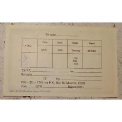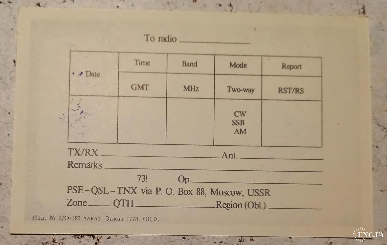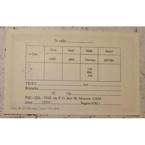 Вся территория СССР была условно разделена на регионы с индексами от 1 до 0. Всего 10 регионов и 15 республик. Украина принадлежала к 5-му региону. Всё это видно на рисунке лицевой стороны. Также здесь имеется штамп коллективной любительской радиостанции г. Иркутска (цифра 0 здесь перечеркнута, чтобы не спутать с буквой О. Это общее правило для всего мира). Такие типовые бланки использовались всеми радиолюбителями СССР, независимо от их местонахождения. Обратная сторонапредназначена для заполнения данными радиообмена в эфире. В данной карточке эти данные не заполнены. Карточка без дефектов. Состояние отличное.