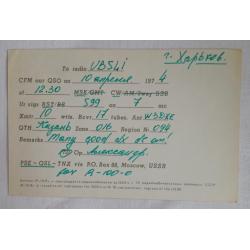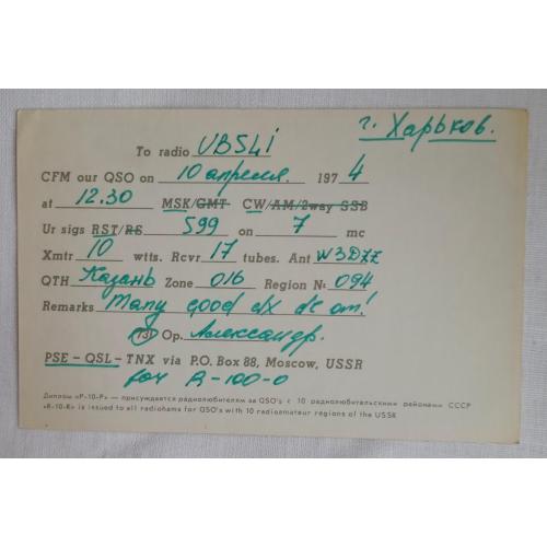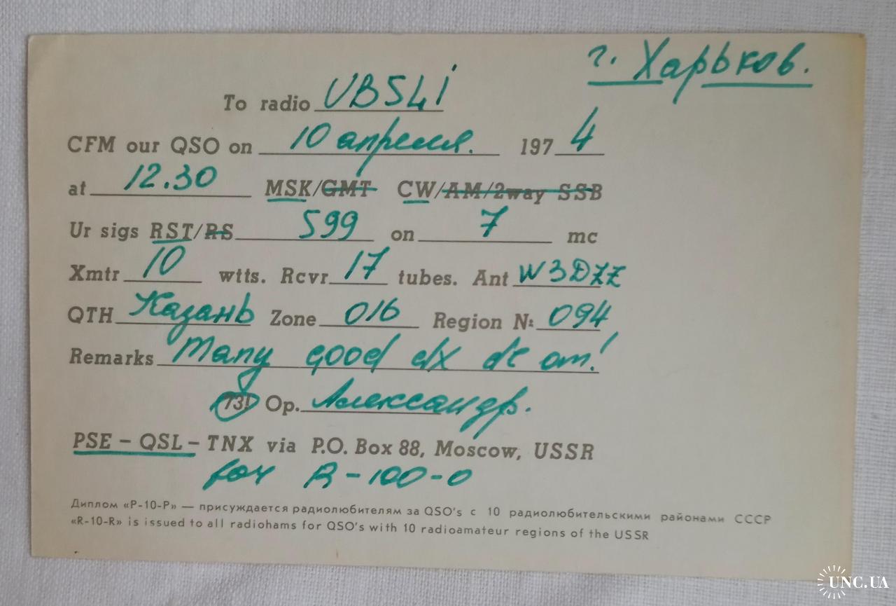 1961-1980На лицевой стороне стоит штамп позывного сигнала радиолюбителя. На обратной – данные радиообмена в эфире. Оператор из Казани. Слегка примят верхний правый уголок. Состояние хорошее.