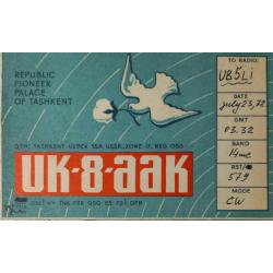 1961-1980Односторонняя карточка коллективной радиостанции республиканского Дворца пионеров. Изображен голубь с веточкой хлопка. Красным выделен позывной-сигнал клубной станции и данные радиообмена в эфире. Карточка без дефектов. Состояние отличное.