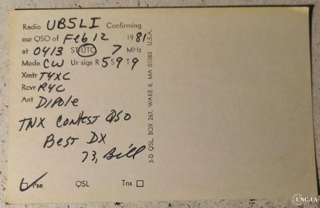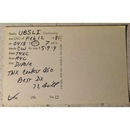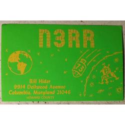 Карточка поражает своей цветовой насыщенностью и типографским изыском лицевой стороны. На ней изображена картинка-комикс космоса.На символической ракете число «73». На радиолюбительскомцифровом коде это означает «Наилучшие пожелания!».Можно также заметить, что на земном шаре обозначены очертания Западного полушария, где и расположены США. Локация Билла (полное имя Уильям) – Колумбия, Мерилэнд. Это некорпоративное сообщество (территория, не имеющая статуса юридического лица и напрямую подчиняющаяся округу Говард), состоящее из 10 автономных деревень с общим населением более 100 тыс, объединенных в один процветающий образцовый город, где все жители имеют легкий доступ к магазинам, школам и открытым пространствам. Сегодня этот район известен своими тротуарами по всему городу , благодаря которым легко добираться пешком или на велосипеде сработы в школу и домой. Обратная сторона карточки заполнена данными радиообмена в эфире в период проходящих международных соревнований (Contest),где я принимал участие. Билл просит прислать мне моюQSL-карточку, подтверждающую нашу с ним радиосвязь ( стоит «птичка» на кубике радиожаргона «Pse», что означает Please – Пожалуйста). Карточка без дефектов. Состояние отличное.