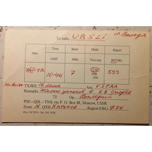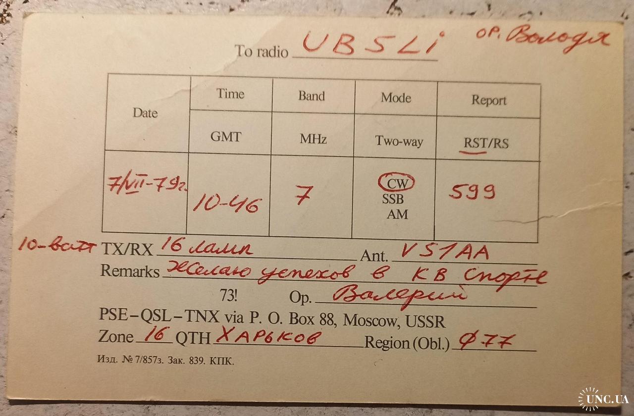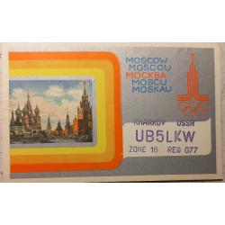 1961-1980На лицевой стороне имеется эмблема Олимпиаы-80 и позывной сигнал радиолюбителя из Харькова. Бланк карточки типовой. Поэтому его мог использовать для заполнения любой радиолюбитель из СССР. На обратной стороне –данные радиообмена в эфире. Карточка имеет малозаметный изгиб правой верхней стороны, не влияющий на общее восприятие композиции. Состояние карточки хорошее.